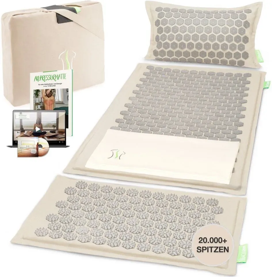 Zustand: Neu - 64,26 € / Stück - Akupressur - BACKLAxx RESLA GmbH - RAB0001 - EAN: 8719689920012 - 🌱 WIRKUNGSVOLL: Die Akupunkturmatte kann Verspannungen lösen, die Durchblutung fördern, entgiftend wirken, Faszien geschmeidig halten und Triggerpunkte lösen. Endorphinausschüttung steigert das Wohlbefinden! 🌱 SCHMERZLINDERND: Die regelmäßige Anwendung von nur 15 Minuten auf der Akupunkturmatte kann Kopfschmerzen, Rückenschmerzen, Nackenschmerzen und mehr lindern! 🌱 ENTSPANNUNG & GLÜCK: In der traditionellen chinesischen Medizin werden Akupressurpunkte durch Nadelreize therapiert. Das bringt innere Energieflüsse ins Gleichgewicht und fördert Selbstheilungskräfte! 🌱 NACHHALTIG: Unsere Stachelmatte Rücken wird umweltschonend hergestellt, ist antibakteriell und schadstofffrei. Verwendet werden für die Faszienmatte Rohstoffe wie Halbleinen, Naturkokosfaser und Naturkautschuk. 🌱 UMFANGREICHES SET: Deutscher E-Mail- und Telefonservice | Fakirmatte | Akupressur Kissen | Tasche | Tuch. GRATIS-Download: 1x Videokurs, 2x Hörbuch mit 110 Minuten Entspannung und 1x eBook. - Verkäufer: RESLA GmbH im amazon.de Marketplace Dieses Set von eBay bietet ein gutes Preis-Leistungs-Verhältnis für ein Akupressurmatten-Set mit Kissen. ![]() ![]() BACKLAxx R - Akupressur Matten eBay Set Massage Kissen Nadel Akupunktur Matte Yoga Profi