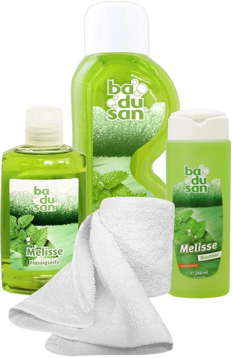 Verfügbarkeit: Auf Lager - Kategorie: Dusch- & Badeartikel - Badusan - GTIN:4012532001635 - Duft des Frühlings Eine hautpflegende und erfrischende Reinigung, zeitsparend und bequem in der Anwendung. Inhalt: 200ml - 12,99 Euro bei Amazon Marketplace Beauty - gefunden von billiger.de Dieses Wohlfühlset mit Melisse bietet eine schöne Auswahl an Badusan-Produkten inklusive Handtuch als Geschenkidee. ![]() ![]() OLShop AG badusan Wohlfühlset Melisse 4-teilig Duschbad, Schaumbad, Flüssigseife Geschenkset mit Handtuch, Baden mit Badusan Pflegeset Beautyset Beautypaket