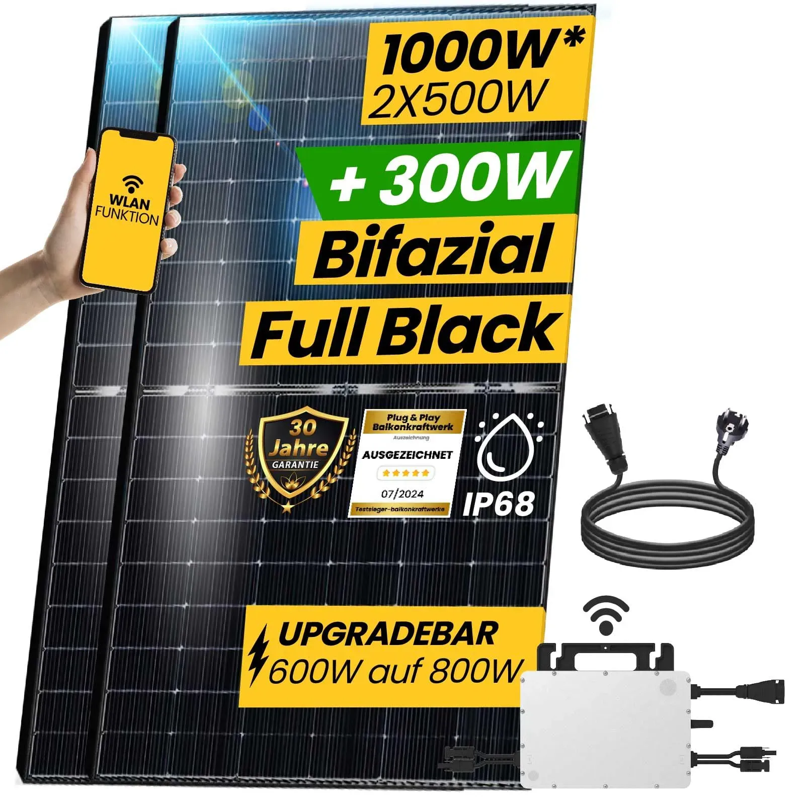 Verfügbarkeit: Auf Lager - Kategorie: Solaranlagen - epp.solar - GTIN:4262426969859 - œ Lieferumfang :- 2x 500W Bifazial Modul Black/Silber Rahmen, 1x HMS HMS-800W-2T Upgradefähiger WIFI Mikrowechselrichter, 1x HMS Feldstecker, 1x 3 Meter + Schukostecker œ Langlebige Bifazial-Solarmodule :- Diese N-Typ monokristallinen Module bieten dank ihrer bifazialen Technologie bis zu 15 % zusätzliche Leistung auf der Rückseite und sind ideal für heiße Klimazonen durch ihren niedrigen Temperaturkoeffizienten von -0,30%/°C. Sie trotzen starken Winden und Schneelasten und gewährleisten durch ihre doppelte Glasstruktur erhöhte Haltbarkeit und Schutz bei Stürmen oder schlechtem Wetter. œ Widerstandsfähige Solartechnik für langfristige Investitionen :- Unsere Solarmodule trotzen den Kräften der Natur mühelos, widerstehen starken Winden (2400 Pa) und schweren Schneelasten (5400 Pa). Mit bifazialen Zellen und Glas auf beiden Seiten bieten sie eine hohe Haltbarkeit und Schutz vor Stürmen oder widrigem Wetter, für jahrzehntelange zuverlässige Leistung. œ Solar-Innovation mit HMS: HMS Wechselrichter sind bekannt für ihre überlegene Qualität und Zuverlässigkeit, die von billigen Alternativen unerreicht bleibt. Verbessern Sie Ihr Balkonkraftwerk Setup mit unserem HMS-800 Wechselrichter. Genießen Sie eine nahtlose Plug & Play-Installation und Wi-Fi-Konnektivität für Echtzeitüberwachung über S-Miles Cloud. Dieser HMS 800 Wechselrichter ist von 600W auf 800W aufrüstbar, ... Für 429.99 Euro erhalten Sie hier ein Solarway Balkonkraftwerk mit einstellbarem Ausgang (600/800/1000W) und App-Steuerung, was Flexibilität und Komfort bietet. ![]() ![]() Solarway Balkonkraftwerk 1000W Komplett Steckdose - Ausgang einstellbar 600/800/1000W - 2x500W JaSolar-Module, Wechselrichter mit APP&WiFi, Plug&Play