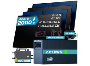Zustand: Neu - Netzgebundene Systeme Netzgebundene Photovoltaikanlagen - Powerness - NEXA+500W*4 NEXA+500W*4 - - All-in-One-System mit hoher PV-Leistung und intelligenter Energieoptimierung: Integriertes All-in-One-Design mit maximaler PV-Eingangsleistung von 2600 W und 4 unabhängigen MPPT-Kanälen - für höchste Effizienz und optimale Energieausbeute bei wechselnden Lichtverhältnissen. Netz- und Inselbetrieb mit Notstromfunktion: Flexibler 800W AC-Ausgang für den netzgekoppelten Betrieb plus integrierte Off-Grid-Funktion - zuverlässige Stromversorgung auch bei Stromausfall. Langlebiger LiFePO‚„-Speicher mit hoher Effizienz: Hochleistungsakku mit sicherer LiFePO‚„-Technologie, langer Lebensdauer und anpassbarer Speicherkapazität für maximale Energieunabhängigkeit. Smarte Steuerung und Robustes Sicherheitsdesign: Einfache Bedienung über WLAN und Bluetooth für Smart-Integration. Robuste Konstruktion mit umfassenden Schutzfunktionen für sicheren, dauerhaften Betrieb. Lieferumfang1x Growatt NEXA 2000, 1x 5m Schuko AC-Ladekabel, 4 Sets x 3m Solarpanel-Verlängerungskabel, Benutzerhandbuch, Erforderliches Zubehör, 4x JaSolar 500W Bifaziale Full-Black-Module. - Verkäufer: Powerness EU GmbH im amazon.de Marketplace Mit 869 Euro ist dieses SUNNIVA® 2000W Balkonkraftwerk mit 2,01 kWh Speicher und bifazialen Glas-Glas Modulen ein attraktives Angebot im mittleren Preissegment. ![]() SUNNIVA® 2000W Balkonkraftwerk mit 2,01 kWh Speicher TSUN TSOL-DCU2000Lite, BIFAZIAL FULLBLACK komplett Steckdose, PV Solaranlage Komplettset mit Solarspeicher,4x 500W N-Type Glas-Glas Bifacial Module