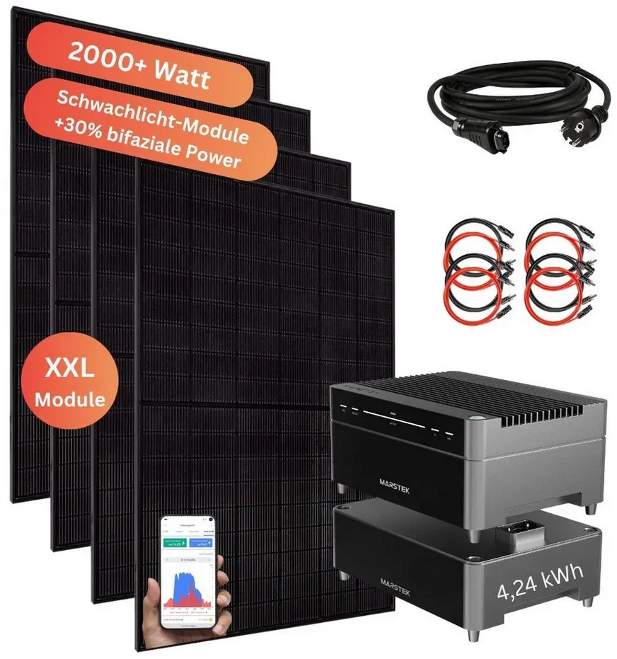 Verfügbarkeit: lieferbar in 3 Wochen - Kategorie: Stromspeicher - myvoltaics - GTIN:4262414423363 - Produktdetails Set beinhaltet , Marstek Venus A 4,24 kWh, Anschlusskabel 2m, Anleitung, 4x bifaziales Schwachlichtmodul (je 500 Watt), 8x Verbindungskabel je 3m ohne Aufständerung, Jahresertrag , 2000 kWh/Jahr, Anzahl Module , 4, Solarzellen pro Modul , 120 St., Zelltyp , mit 4 Modulen 500+ W bifazial , 1 Speichererweiterung 2,12 kwh, Modulwirkungsgrad , 23 %, Eigenschaften , Stromspeicher für Solarstrom; erweiterbar, bidirektional, intelligente KI-Steuerung, Anschlüsse für bis zu 4 Solarmodule, Notstromversorgung über integrierte Steckdose bei Stromausfall, bifaziale Schwachlichtmodule 500 Watt, Plug & Play Installation, Funktionen , Solarstromerzeugung Solarspeicher mit Wechselrichter 800 Watt & WLAN, App zur Steuerung und Auswertung, Geeignet für , Balkon; Terrasse; Garage; Freistehend; Garten; Freifläche; Haus; Keller; Gartenhaus; Carport; Kleingarten; Schrebergarten, Einsatzbereich , Balkon; Terrasse; Garage; Freistehend; Garten; Freifläche; Haus; Keller; Gartenhaus; Carport; Kleingarten; Schrebergarten, Ausrichtung , ohne Aufständerung, Art Montage , zusammenstecken, aufstellen, Betriebstemperatur minimal , -20 °C, Betriebstemperatur maximal , 60 °C, Kompatible Smart-Home-Systeme , Shelly; Ecotracker; Anker; Zendure, Technische Daten Typ Anschluss , Steckdose, Signalübertragung , WLAN, Bluetooth, Schutzart , IP68 (Staub und Wasserschutz) Balkonkraftwerk; IP ... ![]() ![]() MyVoltaics Balkonkraftwerk 2000+ Watt MIT SPEICHER EcoFlow STREAM Ultra X 3,84 kWh Versand 0 €, 2000 W, mit 4 Modulen bifazial XXL & Smartmeter, (Set komplett, 5-St., optional mit Solarmodul Halterung steckerfertig für Steckdose 800 Watt), XXL Solaranlage 800 W Komplettset mit Notstrom vom Speicher bis 2300 W grau|schwarz