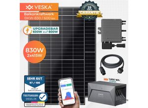 Kategorie: Solaranlagen - Technaxx - GTIN:4260358126296 - TECHXX Solar Balkonkraftwerk 800 W WiFi TX-274, 2x 410 Watt Solarpanele mit 5 m Anschlusskabel Einfaches und nützliches Solarsystem, um Ihren Energieverbrauch zu senken, inkl WiFi Anbringung auf Flachdach, Terrasse, Balkon, Zaun und viele weitere Möglichkeiten Einfache Installation: Anschließen, Loslegen, Stromsparen Daten und Alarme in Echtzeit per S-Miles-APP Datenerfassung zur Energieerzeugung Geeignet für die Einspeisung von Strom in das 230 V Hausnetz Maximale Einspeiseleistung des Inverters 800 W Ideal zur Deckung der Grundlast am Tag in Ihrem Zuhause 3 Bypass-Dioden für verbesserte Stromausbeute Halbzellenmodul 108 (12x9) Rechtliche Hinweise: Für Balkonkraftwerke, deren maximale Gesamtleistung 600 Watt übersteigt, ist der Anschluss an das Hausstromnetz von einer qualifizierten Elektrofachkraft vorzunehmen. Sie müssen Ihre Photovoltaikanlage bei Ihrem zuständigen Netzbetreiber schriftlich anmelden. Darüber hinaus ist eine Meldung an die zuständige Behörde (Marktstammdatenregister (MaStR)) zu erstatten. Sie müssen sichergestellt haben, dass bereits ein geeigneter und ausreichend dimensionierter Einspeiseanschluss vorhanden ist. Zähleraustausch erforderlich: Es muss ein bidirektionaler Zähler vorhanden sein oder je nachdem, was Ihr Stromanbieter vorschreibt, mindestens ein Zähler mit Rücklaufsperre. Einfache Stromzähler sind oft nicht ausreichend. Gegebenenfalls ist die Zustimmung des Vermieters, des Eigentümers ... Das VESKA® Balkonkraftwerk für 899 Euro bietet eine Upgradefunktion auf 800W und einen 1,6 kWh Batteriespeicher, was es zu einer zukunftssicheren Investition macht. ![]() VESKA® Balkonkraftwerk 830W/600 mit Upgradefunktion auf 800W und 1,6 kWh Batteriespeicher