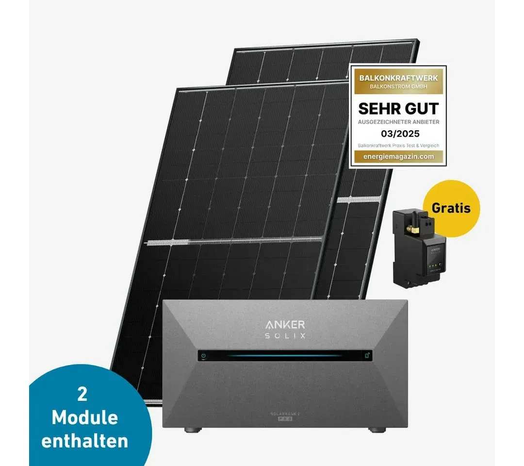 Zustand: Neu - Netzgebundene Systeme Netzgebundene Photovoltaikanlagen - Anker - A17C13Z1 - EAN: 0194644036058 - JÄHRLICH 251€ STROMKOSTEN GESPART: 4 MPPT-Routen unterstützen 2400W, und du kannst Erweiterungsakkus bis zu 9,6kWh Kapazität hinzufügen. All diese Energieeinsparungen führen zu einer massiven Reduzierung deiner Stromrechnung um bis zu 251€. ANTI-ENERGIEVERSCHWENDUNG: Erreiche echte Effizienz mit dem Anker SOLIX Smarten Zähler, der den Stromverbrauch in Echtzeit überwacht, mit einer Reaktionszeit von nur 3 Sekunden. 1 LEISTUNG: Solarbank 2 Pro bietet 6.000 Ladezyklen und 1 Leistung mit einer 10-jährigen . Mit einem IP65-Dichtmittel ist sie wasser- und staubgeschützt und funktioniert bei -20°C. 1000W NOTSTROMVERSORGUNG: Halte wichtige Geräte mit der 1000W AC-Steckdose auch während eines Stromausfalls am Laufen. IM LIEFERUMFANG: Solarbank 2 E1600 Pro, 5m Schuko-Ladekabel, 8× 3m Solarpanel-Verlängerungskabel, Installationszubehör, Anleitungshandbuch. Die Auslieferung erfolgt innerhalb des angegebenen Zeitraums. 0% VAT: Der Preis ist bereits mit 0% VAT ausgewiesen. Der Preis gilt nur für Privatkunden, die die Voraussetzungen für eine umsatzsteuerfreie Lieferung gemäß § 12 Abs. 3 UstG erfüllen. Für Geschäftskunden wird eine zusätzliche Mehrwertsteuer von 19% berechnet und auf den Kaufpreis aufgeschlagen. - Verkäufer: Anker SOLIX im amazon.de Marketplace Ein empfehlenswertes Set mit 890W Leistung und 1600Wh Speicher, inklusive Halterungen und 2x 445W Topcon Solarpanel, was eine gute Basis für ein Balkonkraftwerk darstellt. ![]() ![]()