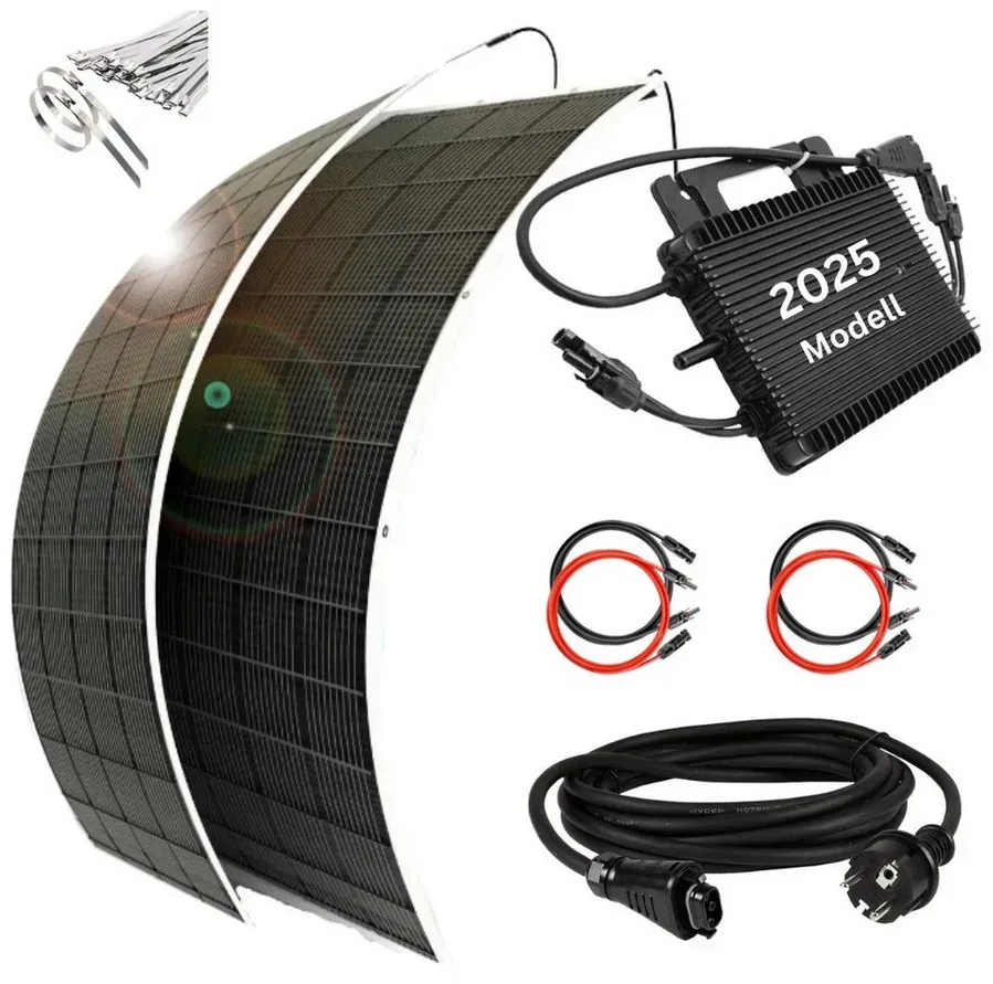 lieferbar-in 4-5 Werktagen bei dirMyVoltaics Balkonkraftwerk MyUltraleicht 620 Watt 2 Module ultraleicht Komplettset Versand gratis, 620 W, flexible Leichtmodule (Dicke 2 mm), (Set komplett, 3-St., inkl. WLAN Wechselrichter 800 Watt (2025er Modell) & allen Kabeln), Modul nur 5kg leicht, glasfrei, Montage in Höhen über 4m möglich schwarz