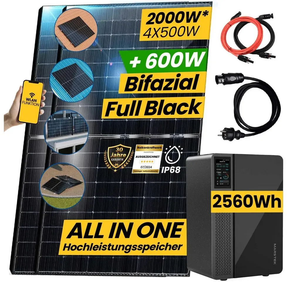 Erneuerbare Energie Wohnen Haus Garten Heimwerken - - Balkonkraftwerk von SUNNIVA 920 W / 800 W mit Marstek Solarspeicher 2,24 kWh Das Premium-Balkonkraftwerk mit einer Maximalleistung von 920 W Pmax vereint den Marstek MST-MI0800 Wechselrichter und den B2500-D Solarspeicher in einem perfekt aufeinander ab - Versandkostenfrei: true - Lieferzeit: 10 Tage - product_flag_accessory_wohnen: true - - - bei Marktkauf - gefunden von shopping24 Dieses 1000W Balkonkraftwerk für 668 Euro bietet eine gute Balance aus Leistung und Speicherkapazität für den durchschnittlichen Verbraucher. ![]() ![]() SUNNIVA® 1000W Balkonkraftwerk mit 2,24 kWh Speicher MARSTEK B2500-D, 2x 500W BIFAZIAL FULLBLACK komplett Steckdose, PV Solaranlage + Solarspeicher