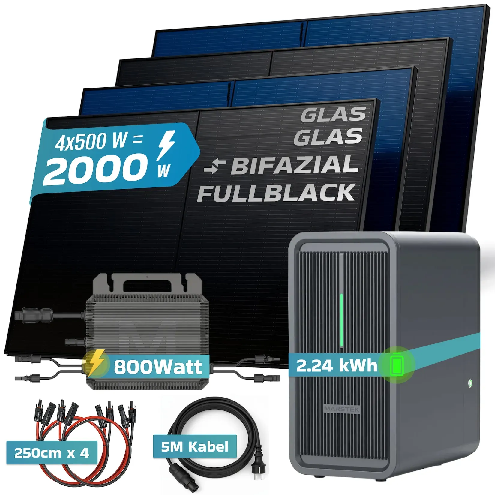 Verfügbarkeit: lieferbar-in 9-11 Werktagen bei dir - Kategorie: Solaranlagen - sunniva - GTIN:4255656237386 - Produktdetails Eigenschaften , Plug&Play einfache Installation, Geeignet für , Balkon, Garten, Gartenhäuser, Dächer, Einsatzbereich , Haus, Technische Daten Kabellänge , 5 m, Schutzart , IP68, WEEE-Reg.-Nr. DE , 53396155, Farbe & Material Farbe , Schwarz, Material Solarmodul , Gehärtetes Glas, Material Solarzellen , Monokristallin, Material Rahmen , Aluminium, - 849,00 Euro bei OTTO - gefunden von billiger.de Für 879 Euro erhalten Sie ein 2000W Balkonkraftwerk mit 2.24 kWh Speicher, das eine starke Leistung für den Eigenverbrauch liefert. ![]() ![]() SUNNIVA® 2000W Balkonkraftwerk mit 2,24 kWh Speicher MARSTEK B2500-D, BIFAZIAL FULLBLACK komplett Steckdose, PV Solaranlage Komplettset mit Solarspeicher, 4x 500W N-Type Glas-Glas Bifacial Module