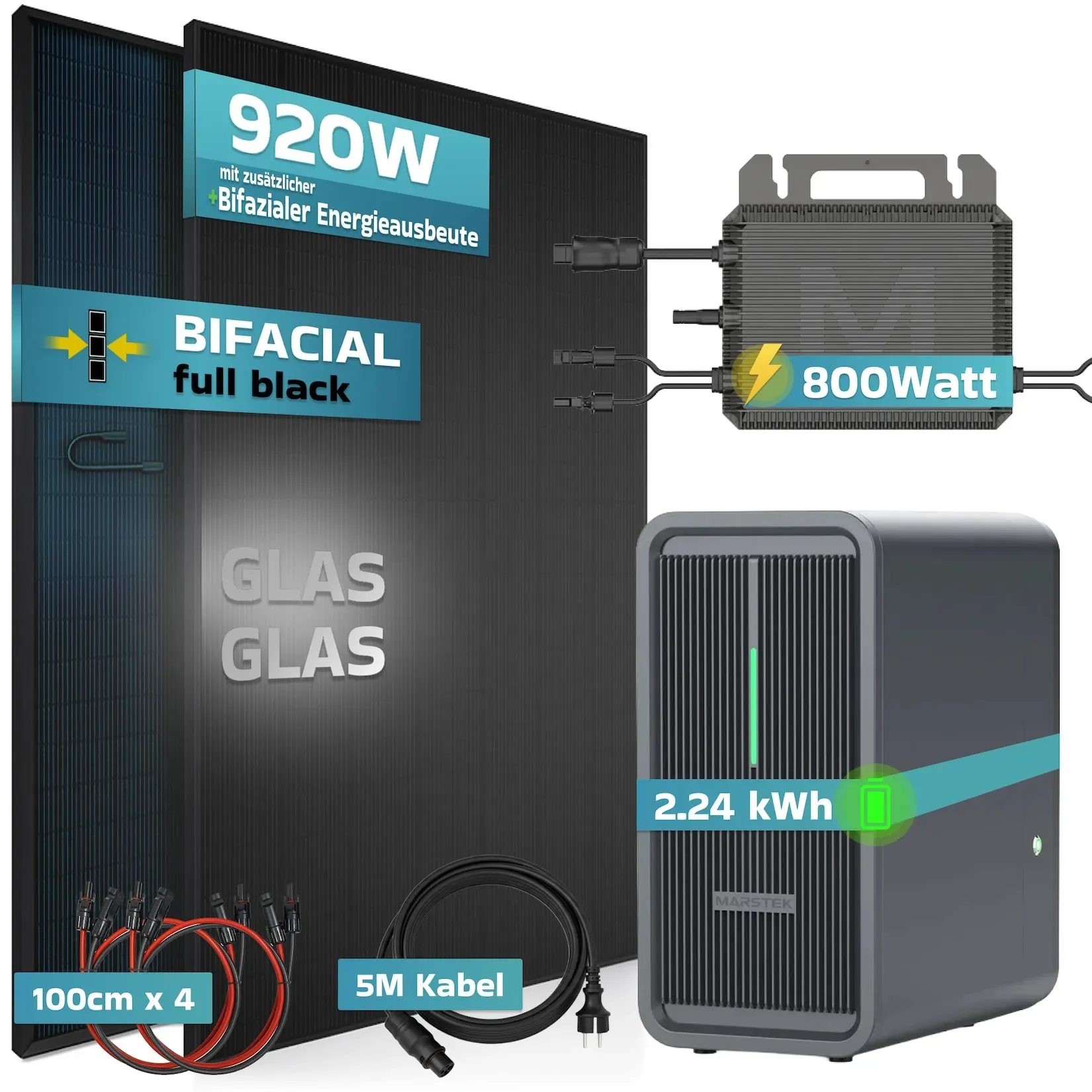 Verfügbarkeit: 10 Werktage - Kategorie: Solaranlagen - sunniva - GTIN:4255656237348 - Balkonkraftwerk von SUNNIVA 1000 W / 800 W mit Marstek Solarspeicher 2,24 kWhDas Premium-Balkonkraftwerk mit einer Maximalleistung von 1000 W Pmax vereint den Marstek MST-MI0800 Wechselrichter und den B2500-D Solarspeicher in einem perfekt aufeinander abgestimmten System. Dank Plug&Play-Anschluss ist die Anlage ideal für Balkon, Dach, Terrasse, Garage oder Garten und lässt sich vielseitig einsetzen.Mit zusätzlicher bifazialer Energieausbeute.Mit der Fähigkeit, Sonnenlicht von beiden Seiten einzufangen, kann dieses bifaziale 500-Watt-Solarmodul im Vergleich zu herkömmlichen Solarmodulen mehr Energie liefern.Plug & PlayWechselrichter & Speicher: Marstek MST-MI0800 + B2500-D (2,24 kWh)Das Gewicht des Marstek B2500 Solarstromspeichers beträgt 20 kgMaximale Ladeleistung: 1.050 WMaximale Entladeleistung: 1.200 WAC-Ausgangsleistung: 800 WWIFI & Bluetooth-KommunikationBIFAZIALE Glas-Glas Solarmodule, FULL BLACKHohe Energieausbeute & LanglebigkeitGesamtleistung Solarmodule: Pmax 1000 W (2 Ã 500 W)SOLARMODULELeistung pro Panel: PMax 500 WattBifazialZellentyp: Monokristallin NMaße(LxBxH): ca.1906x 1134 x 30 mmFrontscheibe mit Antireflexbeschichtung: ca. 2,0 mm Rückscheibe mit Wärmegehärtetem Glas: ca. 2,0 mmRahmen: Eloxierte Aluminiumlegierung, SchwarzGewicht: ca.30 kgBIFAZIAL, Full Black, Glas-GlasLieferumfang:2 x Solar Module mit je 500W PMax: 1000W Gesamtleistung und zusätzlicher ... Dieses 1840W Balkonkraftwerk für 849 Euro bietet eine höhere Leistung und 2.24 kWh Speicher, ideal für Haushalte mit höherem Energiebedarf. ![]() ![]() SUNNIVA Balkonkraftwerk 1840W Balkonkraftwerk mit 2,24 kWh Speicher Marstek B2500-D, (BIFAZIAL FULLBLACK komplett Steckdose, PV Solaranlage Komplettset mit Solarspeicher, 4x 460W N-Type Glas-Glas Bifacial Module) schwarz