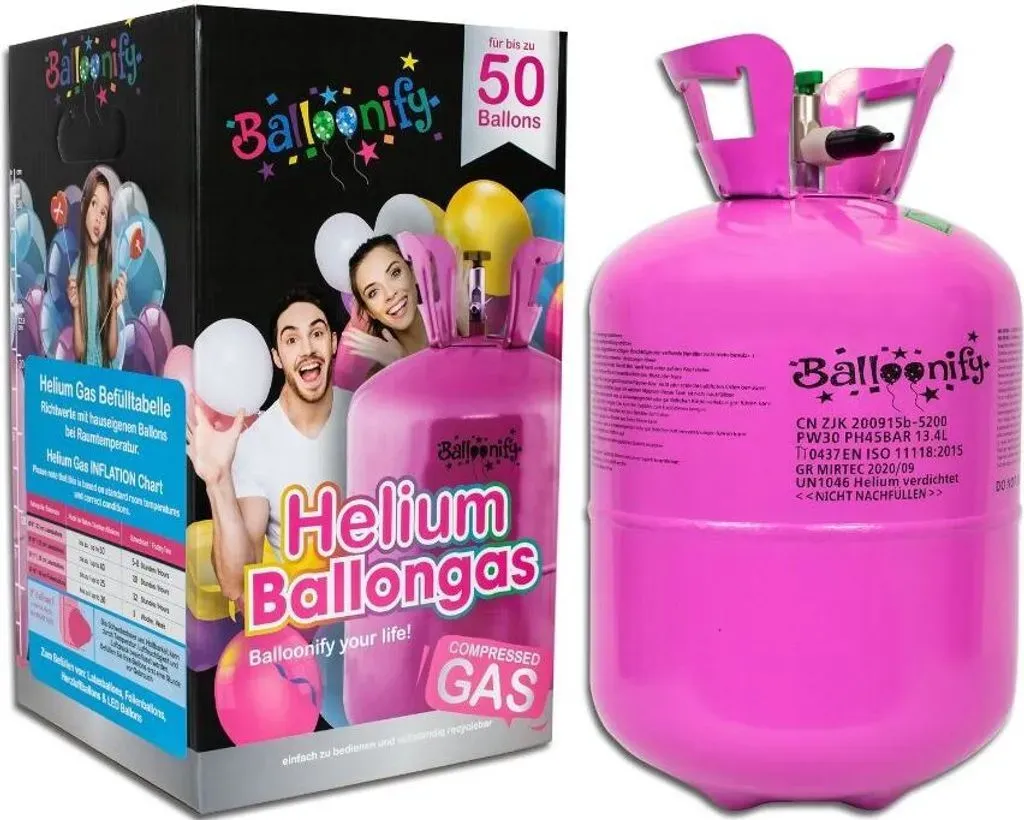Kategorie: Party-Deko - Party Factory - GTIN:4260432844009 - Mit dem Helium Ballongas von Party Factory wird jede Feier zum echten Highlight und das schon vor dem ersten Gast! Ob Geburtstag, Hochzeit, Firmenfeier oder Kinderparty: Fliegende Ballons sorgen für Stimmung, Atmosphäre und leuchtende Augen.Dank der leicht zu bedienenden Einwegflasche befüllst du Latex- und Folienballons im Handumdrehen ganz bequem von zu Hause aus. Die Flasche reicht für bis zu 50 Ballons und ist ideal für spontane Partys oder geplante Events.Highlights auf einen Blick:Für bis zu 50 schwebende BallonsPerfekt für Hochzeiten, Geburtstage, Weihnachtsfeiern & Co.Geeignet für Latex- und FolienballonsSchnell, sicher und einfach in der AnwendungFlasche mit praktischem Knickventil für einfaches BefüllenMit Schritt-für-Schritt-Anleitung auf dem ProduktAbgefüllt in DeutschlandProduktdetails: Maße: 24 x 24 x 43 cm Material: Metall Farbe: Rot Lieferumfang: 1 x Helium Ballongasflasche (Einweg), reicht für ca. 50 Ballons (Ballons nicht enthalten)Tipp: Fülle die Ballons erst kurz vor dem Einsatz das sorgt für beste Schwebeeigenschaften!Temperatur beachten: Helium dehnt sich bei Wärme aus und zieht sich bei Kälte zusammen. Vorsichtsmaßnahmen beim Umgang mit Helium BallongasBitte beachten Sie folgende Sicherheitshinweise für eine sachgemäße und sichere Verwendung des Helium Ballongases:Nicht einatmen! Helium ist ein farb- und geruchloses Edelgas, das beim Einatmen den Sauerstoff in der Lunge verdrängen kann. Das ... Dieses Ballongas für 50 Luftballons ist eine gute Wahl für alle, die eine gröÃ?ere Menge benötigen. ![]() ![]() Balloonify Helium Ballongas Kanister für 50 Luftballons - Rosa