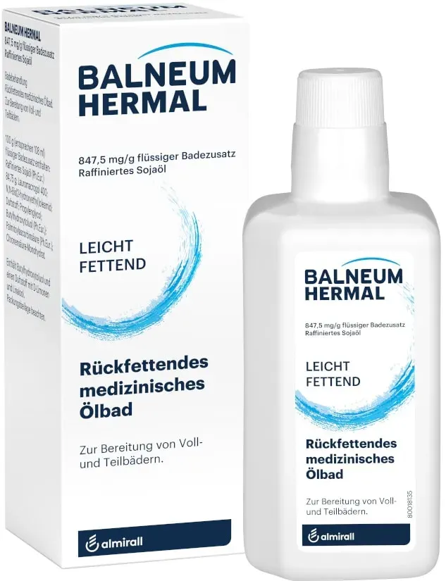 Verfügbarkeit: in 1 bis 2 Werktagen lieferbar - 28,61 €/l - Kategorie: Arzneimittel - Aqeo - GTIN:4042762414035 - PZN:07368080 - Wirkstoff: Raffiniertes Sojaöl. Anwendungsgebiete: Zur unterstützenden Behandlung von Hautkrankheiten mit trockener, leicht juckender Haut, wie z.B. atopisches Ekzem (Neurodermitis), Psoriasis (Schuppenflechte), Ichthyosis (Fischschuppenerkrankung), Pruritus senilis (Altersjuckreiz), Ekzeme wie Windelekzem, Waschekzem. Warnhinweise: Enthält Butylhydroxytoluol und einen Duftstoff mit D-Limonen und Linalool. Nicht mit den Augen in Berührung bringen! Erhöhte Rutschgefahr in Wannen und Duschen. Almirall Hermal GmbH ? D-21462 Reinbek ? www.almirall.de ? info@almirall.de - 28,61 Euro bei Sanicare Apotheke - gefunden von billiger.de ![]() ![]() BALNEUM Hermal flüssiger Badezusatz bei trockener Haut 2X500 ml Flüssigkeit
