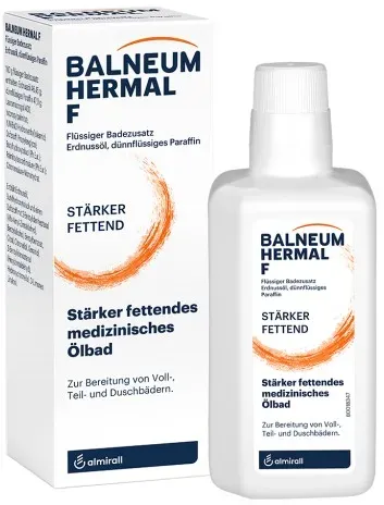 28,04 /l - Kategorie: Arzneimittel - Aqeo - GTIN:4042762414059 - PZN:02328561 - ölbad Balneum Hermal F ist ein medizinisches, stark fettendes ölbad gegen sehr trockene und/oder schuppende, leicht juckende HautEs stabilisiert das Hydro-Lipid-System der Haut und unterstützt so die Wiederherstellung der natürlichen HautbarrierefunktionFür sehr trockene Haut, z. B. bei Neurodermitis und PsoriasisZur Bereitung von Voll- und TeilbädernMit Erdnussöl und Paraffin für eine intensive Fettung der HautReduziert den transepidermalen WasserverlustAnwendung: im Abstand von 2-3 TagenPflichttext:Balneum Hermal FAnwendungsgebiete: Zur unterstützenden Behandlung bei trockener, schuppender, juckender und empfindlicher Haut wie z. B. atopisches Ekzem (Neurodermitis), Schuppenflechte (Psoriasis), Fischschuppenkrankheit (Ichthyosis). Warnhinweise: Enthält Erdnussöl, Butylhydroxytoluol und einen Duftstoff mit D-Limonen und Linalool. Nicht mit den Augen in Berührung bringen! Erhöhte Rutschgefahr in Wannen und Duschen. Stand: Mai 2022Almirall Hermal GmbH D-21462 Reinbek www.almirall.de info@almirall.de Zu Risiken und Nebenwirkungen lesen Sie die Packungsbeilage und fragen Sie Ihre ärztin, Ihren Arzt oder in Ihrer Apotheke. - 14,02 Euro bei medpex.de - gefunden von billiger.de Ein attraktives Angebot für die 500 ml Größe, gut für den Vorrat. ![]() ![]() Aqeo BALNEUM Hermal F flüssiger Badezusatz 500 ml