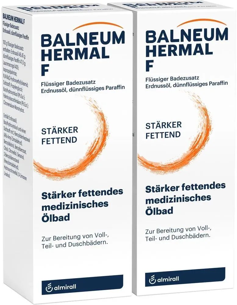 24,10 /l - Kategorie: Arzneimittel - Aqeo - GTIN:4042762414066 - PZN:07368097 - ölbad Balneum Hermal F ist ein medizinisches, stark fettendes ölbad gegen sehr trockene und/oder schuppende, leicht juckende HautEs stabilisiert das Hydro-Lipid-System der Haut und unterstützt so die Wiederherstellung der natürlichen HautbarrierefunktionFür sehr trockene Haut, z. B. bei Neurodermitis und PsoriasisZur Bereitung von Voll- und TeilbädernMit Erdnussöl und Paraffin für eine intensive Fettung der HautReduziert den transepidermalen WasserverlustAnwendung: im Abstand von 2-3 TagenPflichttext:Balneum Hermal FAnwendungsgebiete: Zur unterstützenden Behandlung bei trockener, schuppender, juckender und empfindlicher Haut wie z. B. atopisches Ekzem (Neurodermitis), Schuppenflechte (Psoriasis), Fischschuppenkrankheit (Ichthyosis). Warnhinweise: Enthält Erdnussöl, Butylhydroxytoluol und einen Duftstoff mit D-Limonen und Linalool. Nicht mit den Augen in Berührung bringen! Erhöhte Rutschgefahr in Wannen und Duschen. Stand: Mai 2022Almirall Hermal GmbH D-21462 Reinbek www.almirall.de info@almirall.de Zu Risiken und Nebenwirkungen lesen Sie die Packungsbeilage und fragen Sie Ihre ärztin, Ihren Arzt oder in Ihrer Apotheke. - 24,10 Euro bei medpex.de - gefunden von billiger.de Dieses Angebot für die 1000 ml Flasche ist eine kostengünstige Option für den Langzeitgebrauch. ![]() ![]() Aqeo Balneum Hermal F 1000 ML