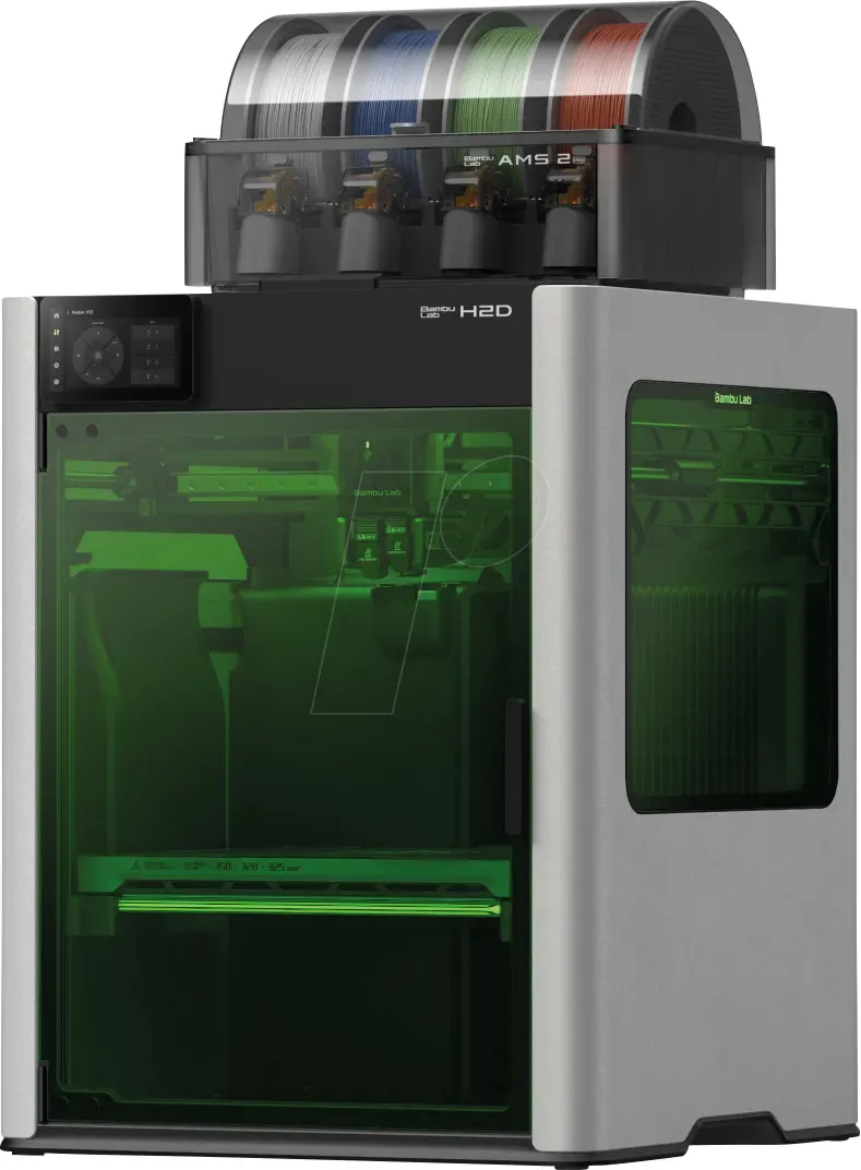 2 Händlerangebote bei billiger.de - Kategorie: 3D-Drucker - Bambu Lab - ACHTUNG!Bambu Lab H2D Combo Sofort bereit für mehrfarbigen 3D-DruckErlebe die ultimative Freiheit im 3D-Druck mit dem Bambu Lab H2D Combo. Dieses Komplettset kombiniert den leistungsstarken H2D 3D-Drucker mit dem fortschrittlichen AMS 2 Pro, sodass du direkt aus der Box mit mehreren Farben und Materialien starten kannst. Ideal für professionellen und kreativen Einsatz.Dank der doppelten Druckköpfe und dem intelligenten AMS 2 Pro-System druckst du mühelos mit maximal vier Farben oder Materialien gleichzeitig, ohne manuelles Wechseln. Möchtest du noch weiter erweitern? Das System unterstützt maximal 4 AMS 2 Pro und 8 AMS HT-Einheiten, was bis zu 24 Farben oder Materialien ermöglicht.Vorteile des Bambu Lab H2D Combo: Direktes Drucken in mehreren Farben und Materialien Doppelte Druckköpfe für 2-Farben- oder 2-Material-Drucke Inklusive AMS 2 Pro für den Druck in 4 Farben oder Materialien Erweiterbar auf 24 Farben mit zusätzlichen AMS-Einheiten Großes Bauvolumen von 350x320x325 mm Leistungsstarkes 350 C Hotend und beheizter Bauraum bis 65 C Präzise 5-Mikron optische Bewegungskalibrierung Closed-Loop-Servo-Extruder für konstante FilamentzufuhrDie H2D Combo ist perfekt für Anwender, die das Maximum aus ihrem 3D-Drucker herausholen möchten, egal ob Sie komplexe Prototypen, funktionale Teile oder farbenfrohe Designs drucken.Mehrfarbiges und Multimaterial-Drucken von Anfang anMit zwei Druckköpfen und dem ... Diese "Laser Edition 10W Full Combo" ist eine attraktive Option für Nutzer, die einen 3D-Drucker mit integrierter Laserfunktion suchen. ![]() ![]() 3D-Drucker BAMBU - LAB H2D eBay LASER EDITION 10W FULL COMBO