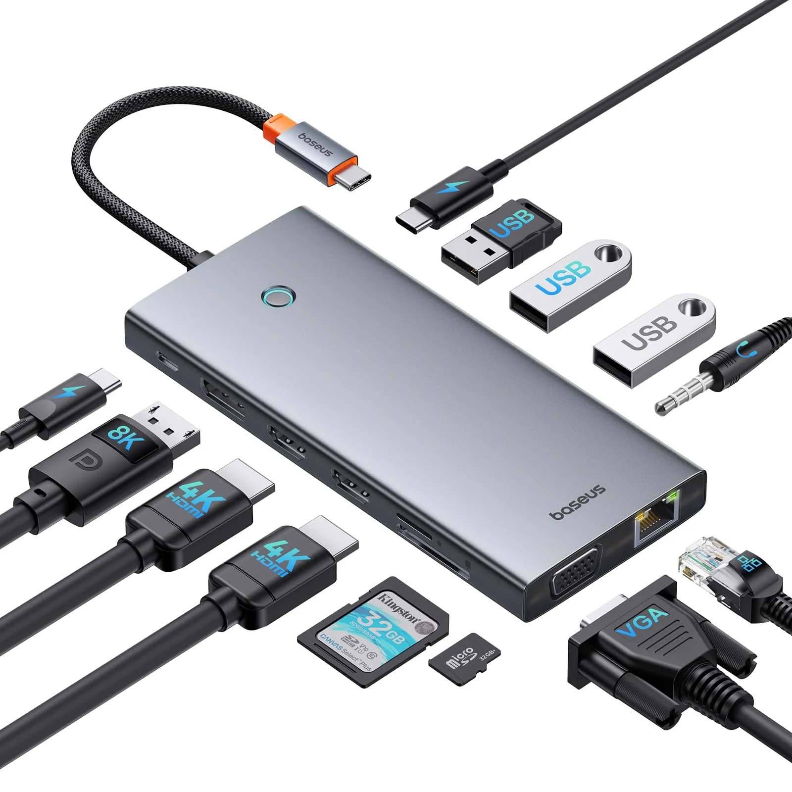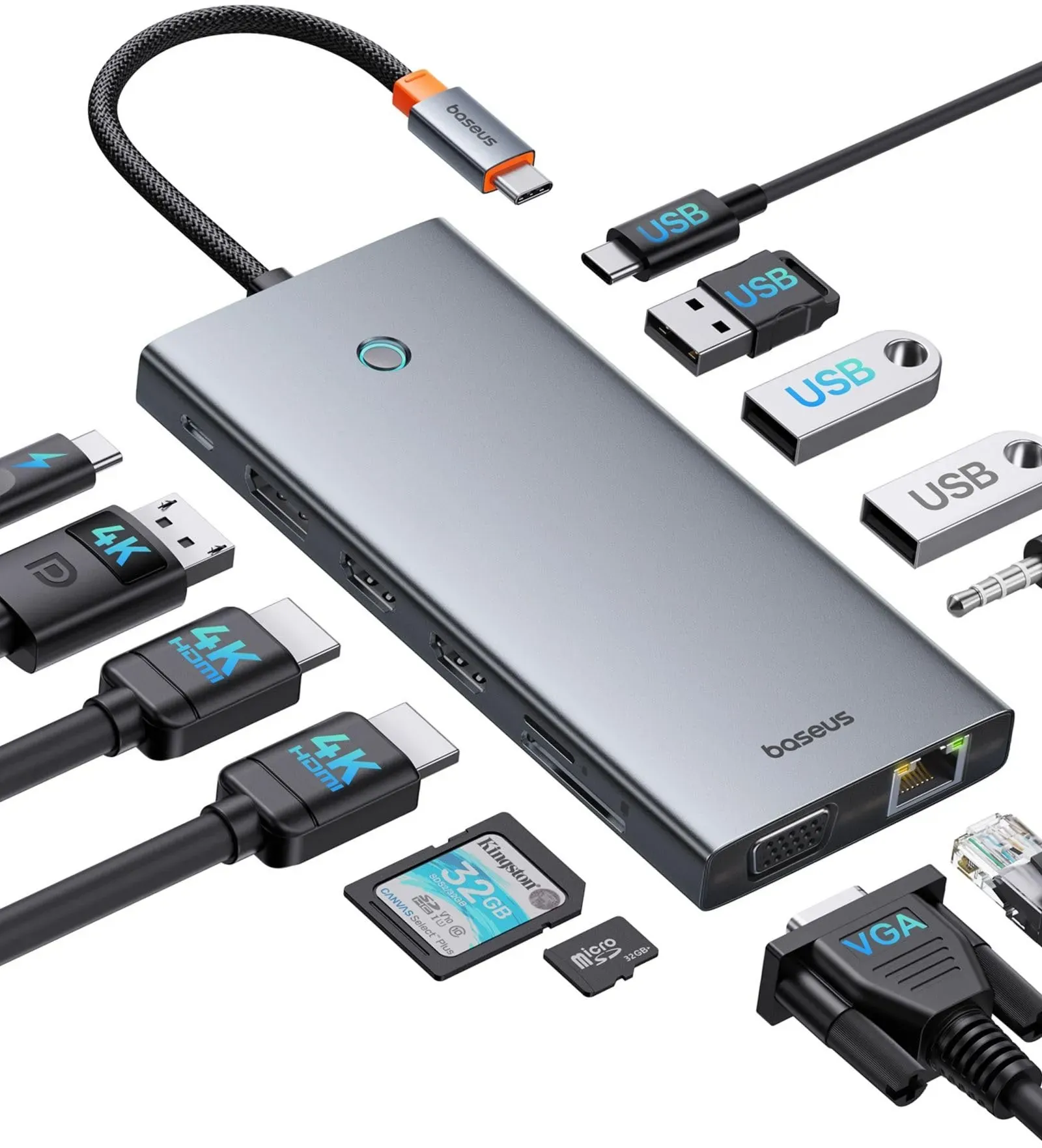 Auf Lager Versand durch Amazon?Chip-Optimiert?Baseus USB C Docking Station 3 Monitore, 13-in-1 USB C Hub mit 2 HDMI 4K@60Hz, DisplayPort 4K@60Hz, VGA, USB 3.1 10 Gbps, PD 100W und Ethernet für Dell/HP/Lenovo/Surface Laptop