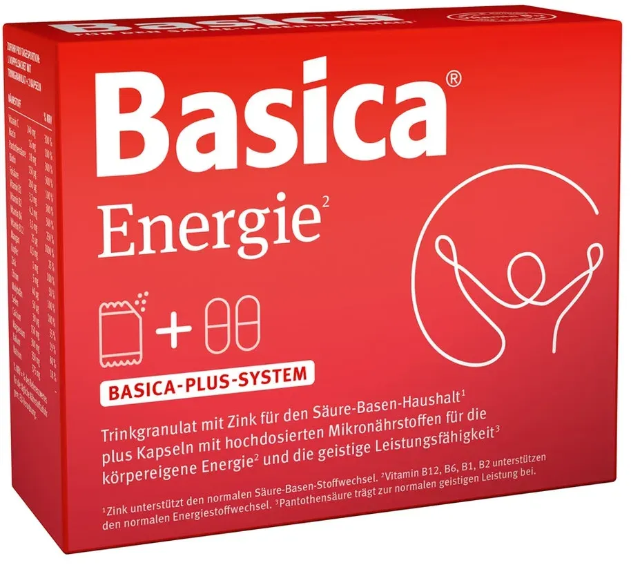 Verfügbarkeit: 1-4 Werktage - 1,00 €/Stück - Kategorie: Nahrungsergänzungsmittel - Basica - GTIN:4260124360930 - PZN:17527119 - Anwendungsgebiet von Basica Energie Basica Energie - Für körpereigene Energie* und geistige Leistungsfähigkeit** Nahrungsergänzungsmittel mit basischen Mineralstoffen, Spurenelementen und Vitaminen. Trinkgranulat und Kapseln liefern hochdosierte Mikronährstoffe für die körpereigene Energie* und die geistige Leistungsfähigkeit**. Das basische Trinkgranulat unterstützt mit Zink den normalen Säure-Basen-Stoffwechsel. * Vitamin B12, B6, B1, B2, Biotin und Kupfer unterstützen den normalen Energiestoffwechsel. * Magnesium, Folsäure und Niacin tragen dazu bei, Müdigkeit und Erschöpfung zu verringern. ** Pantothensäure trägt zur normalen geistigen Leistung bei. Kalium unterstützt die normale Funktion des Nervensystems und Calcium trägt zu einer normalen Signalübertragung zwischen den Nervenzellen bei. Wirkstoffe / Inhaltsstoffe / ZutatenZutaten von Basica Energie : Basisches Trinkgranulat: Natriumcitrat, Calciumlactat, Säuerungsmittel Zitronensäure, Magnesiumcitrat, Kaliumcitrat, Kaliumhydrogencarbonat, Maltodextrin, natürliches Zitronenaroma, Zinkcitrat, Süßungsmittel Sucralose, Chromchlorid, Natriummolybdat, Natriumselenat. Kapseln: Calciumascorbat, Magnesiumoxid, Hydroxypropylmethylcellulose, Maisstärke, Trennmittel Talkum, Palmfett (ganz gehärtet), Emulgator Mono- und Diglyceride von Speisefettsäuren, Maltodextrin, ... Shop Apotheke DE bietet die 30-Tages-Kombipackung zu einem wettbewerbsfähigen Preis von 31.40 Euro an. ![]() ![]() Basica Energie Trinkgranulat+Kapseln f.30 Tage Kpg 30 St Kombipackung
