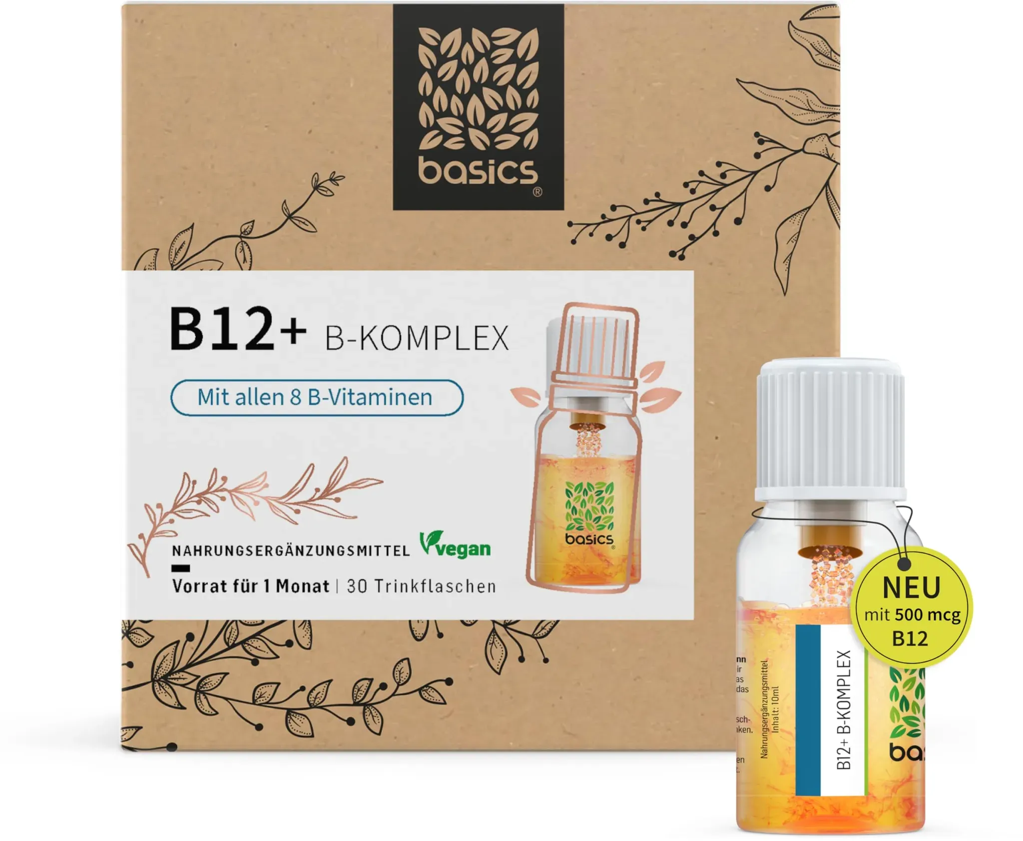 Verfügbarkeit: Auf Lager - Kategorie: Nahrungsergänzungsmittel - Basics - GTIN:4250453305719 - VITAMIN B12 HOCHDOSIERT: Vitamin B12 unterstützt die normale Funktion des Immunsystems und des Energiestoffwechsels und hilft, Müdigkeit zu verringern*. Es trägt außerdem zur normalen psychischen Funktion und zur Bildung roter Blutkörperchen bei*. 8 B-VITAMINE: Neben Vitamin B12 enthält unser Produkt Thiamin (B1), Riboflavin (B2), Niacin (B3), Pantothensäure (B5), Vitamin B6, Biotin (B7) und Folsäure (B9), die zusammen beitragen können, die Zellen vor oxidativem Stress zu schützen und die allgemeine Gesundheit zu fördern*. * gemäß zugelassener gesundheitsbezogener Angaben 2-KAMMER-SYSTEM: Dieses innovative Design schützt die Nährstoffe vor Licht, Hitze und Feuchtigkeit. Die frische Mischung der Vitamine unterstützt die Wirksamkeit, während die flüssige Form die Aufnahme im Körper fördern kann. EINFACHE DOSIERUNG: Nehmen Sie täglich eine 10-ml-Ampulle unserer leckeren Flüssigkeit ein, um maximalen Nutzen zu erzielen. Ideal für unterwegs und jederzeit eine angenehme Ergänzung Ihrer Wellness-Routine! HERGESTELLT IN DEUTSCHLAND: Unsere GMP- und HACCP-Zertifizierungen gewährleisten höchste Qualität. Unser Nahrungsergänzungsmittel ist laktosefrei, glutenfrei und enthält keine GVO, zugesetzten Zucker sowie künstliche Farb- und Geschmacksstoffe. - 21,99 Euro bei Amazon Marketplace Health & Personal Care - gefunden von billiger.de Dieses Produkt bietet eine praktische Monatskur mit hochdosiertem Vitamin B12 und B-Komplex zur Steigerung der Energie. ![]() ![]() basics B12 + B-Komplex mit allen 8 B-Vitaminen - Hochdosiert mit 500mcg Vitamin B12 - für mehr Energie und Unterstützung des Nervensystems - 30 Trinkflaschen - 10ml pro Tagesdosis ? Vegan