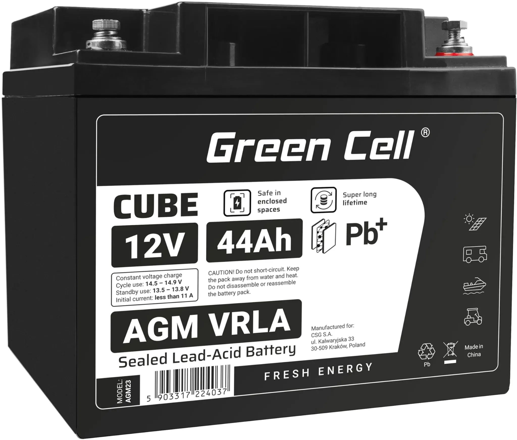 Kategorie: Autobatterien - Green Cell - GTIN:5907813969324 - Das spezielle Design dieses Akkus verhindert zuverlässig das Austreten von Elektrolyt, was einen sicheren und störungsfreien Betrieb unter allen Bedingungen gewährleistet. Genießen Sie die außergewöhnlich lange und problemlose Nutzung dieser Batterie. Dies ist eine ideale Lösung für Anwender, die Wert auf Komfort und minimalen Arbeitsaufwand legen. Dieser Akku zeichnet sich durch hohe Vibrationsfestigkeit und stabile Funktion in einem breiten Temperaturbereich aus, was die Installation in jeder Position ermöglicht. Dieser Akku ist sowohl für den Pufferbetrieb als Notstromversorgung (z.B. USV, Alarmsysteme) als auch für den Zyklenbetrieb, bei dem der Akku regelmäßig geladen und entladen wird. Mit einer Kapazität von 44Ah und einer Spannung von 12V ist dieser Akku eine universelle Stromquelle, die mit einer Vielzahl gängiger Geräte kompatibel ist. - 96,95 Euro bei Amazon Marketplace CE - gefunden von billiger.de Die Sunstone Power AGM Batterie ist eine wartungsfreie VRLA-Batterie, ideal für USV- und Solaranwendungen. ![]() ![]()