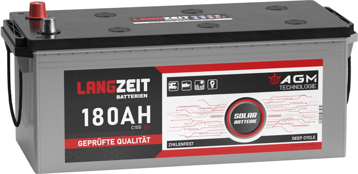 EAN: 4260713247031 - Langzeit AGM Solar 180Ah Batterie 12VoltSicherheit und Kraft pur Dank der neuen AGM Glasvlies TechnologieDie LANGZEIT AGM Solar Batterien kommen komplett ohne flüssige Säure aus. Die Säure ist in einem Glasvlies gebunden, so dass die Batterie in praktisch jeder Lage eingebaut werden kann. Das verschlossene System ist mit einem überdruckventil, dem VRLA ausgestattet. In der AGM Technologie werden die guten Eigenschaften der Säure- und Gelbatterien miteinander vereint.Langzeit AGM Longlife Technology längere Lebensdauer und sehr hohe Zyklenfestigkeit. Für den Photovoltaikeinsatz optimiert. Bitte beachten Sie das AGM Batterien auch nur mit einem Ladegerät welches für AGM Batterien geeignet ist geladen werden. Technische Daten:Länge: 513mmHöhe inkl. Pole: 223mmBreite: 223mmNennspannung: 12VKapazität: 180Ah/C100, 160Ah/C20Erhaltungsladung: 13,6V - 13,8VLadeschlussspannung: 14,6V - 14,8VMax. Ladestrom: 48APole: (Stirnseite)Bodenleiste: B0Gewicht: 47 KgProduktvorteile:Innovative AGM Technologie mit Vlies SeperatorHochwertiges MarkenproduktDual Anwendungen (Antriebs- und Bordnetzbatterie)Sehr gute Leistung auch im geringen Ladezustand3-4 fach höhere ZyklenfestigkeitVRLA-Sicherheitsventile gegen überdruckHöhere Ladekapazität und enormer EnergiedurchsatzVersiegeltes Gehäuse, Spezieller rüttelfester AufbauFür den Photovoltaikeinsatz optimiert!Kipp- und auslaufsicher sowie rüttelfest bis zu 360 In jeder Lager und im Innenraum verbaubar (keine Gase)Sehr hohe ... Sie erhalten mehr Ergebnisse, aktuelle Angebote und weitere Preisbereiche wenn Sie den Preisvergleich aktualisieren: Mehr batterie agm Angebote Jetzt live Meta-Preisvergleich starten! Batterie agm Testberichte