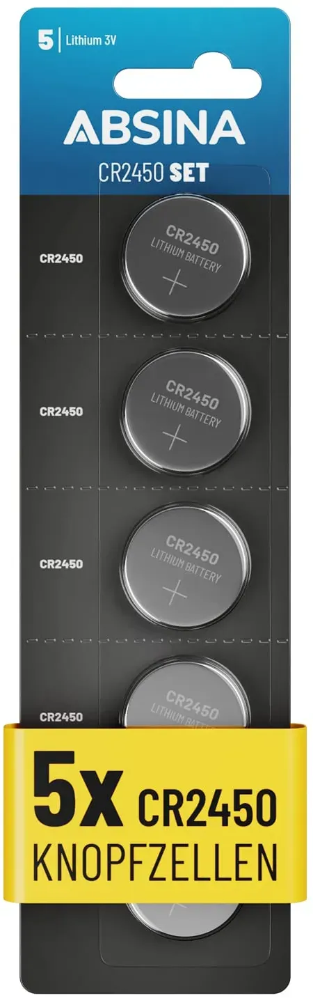 Kategorie: Batterien & Akkus - MediaRange - GTIN:4260283116072 - Typ: Lithium Knopfzelle Abmessungen: 24x5mm Spannung: 3V Kapazität: 540mAh 0% Kadmium und Quecksilber - 6,49 Euro bei Amazon Marketplace CE - gefunden von billiger.de ABSINA bietet ein 5er-Pack mit auslaufsicheren Batterien für 6.99 Euro, was eine gute Option für Langlebigkeit ist. ![]() ![]() ATMT ABSINA CR2450 Knopfzelle 5er Pack für Blitzerwarner UVM - CR 2450 3V Knopfzellen auslaufsicher & Lange Haltbarkeit - CR 2450 Batterien, Knopfzellen CR2450, Batterie 2450, 2450 Batterie, CR2450 3V