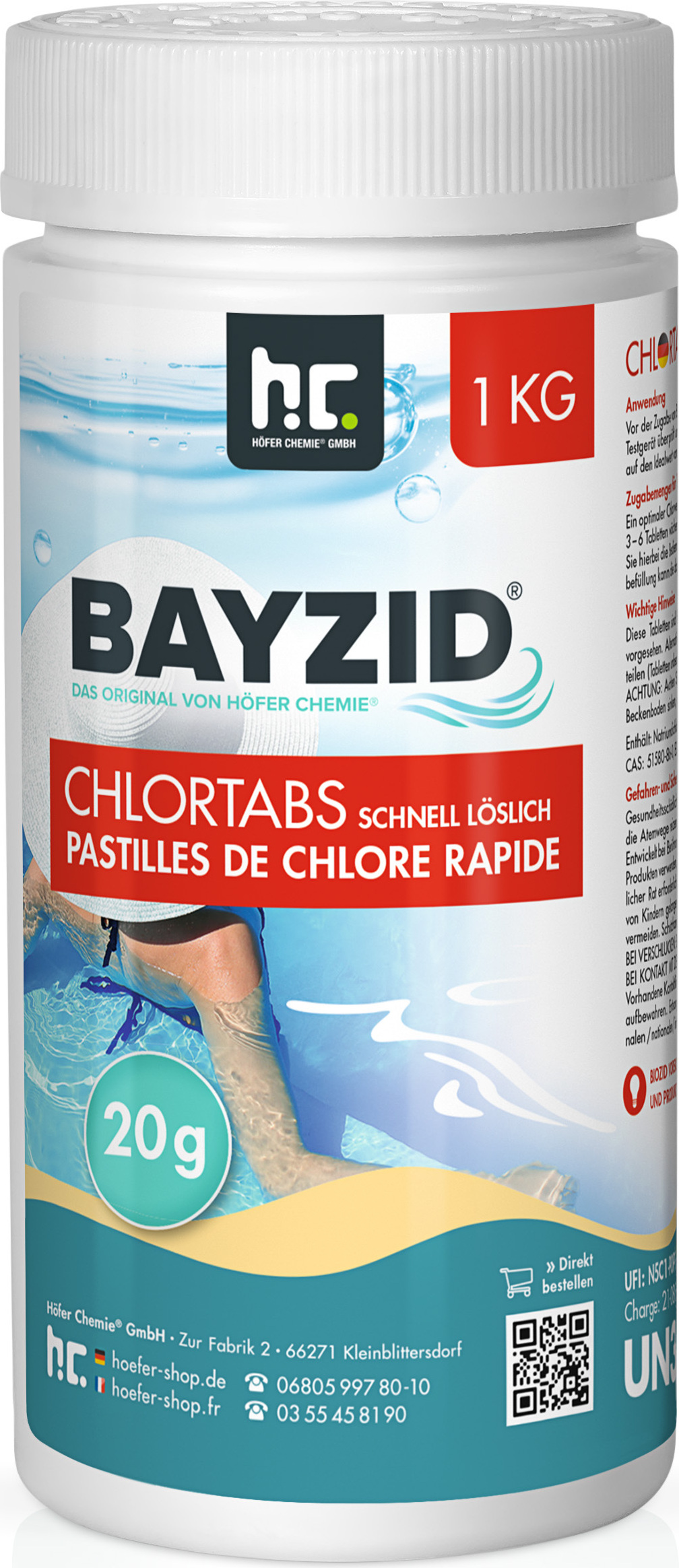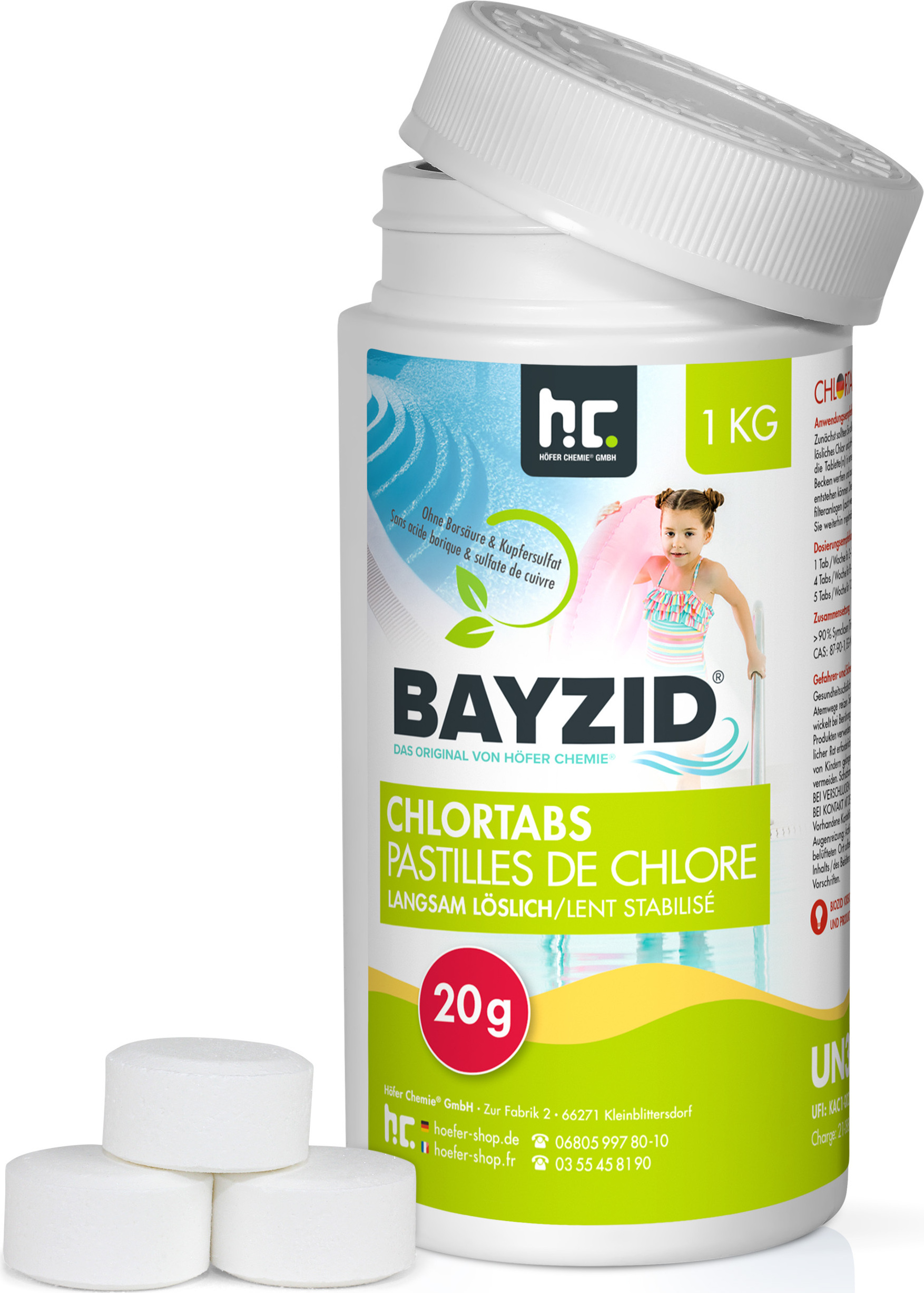 Z.B. BAYZID Chlortabs 20g langsam löslich 1 kg bzw. 5 kg: Z.B. BAYZID Chlortabs 20g schnell löslich 1 kg oder 5 kg: Wichtig: