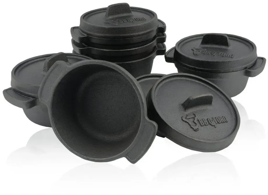 Auf Lager Versand durch AmazonBBQ-Toro Mini Dutch Oven Set (6 Stück), Ø 11 cm, bereits eingebrannt - preseasoned, Gusseisen Serviertöpfe, Kochtopf kleiner Bräter Gusstopf