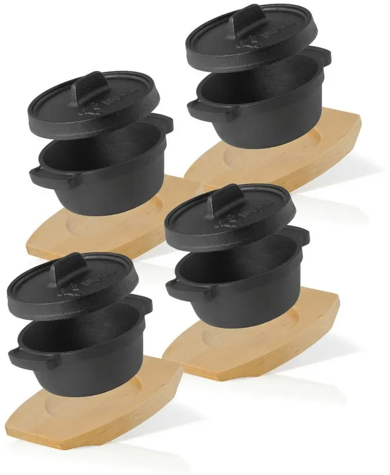 lieferbar-in 3-4 Werktagen bei dirBBQ-Toro Serviertopf Mini Dutch Oven (4 Stück), 11 cm, Gusseisen Topf mit Holzunterlage, Gusseisen (Set) schwarz