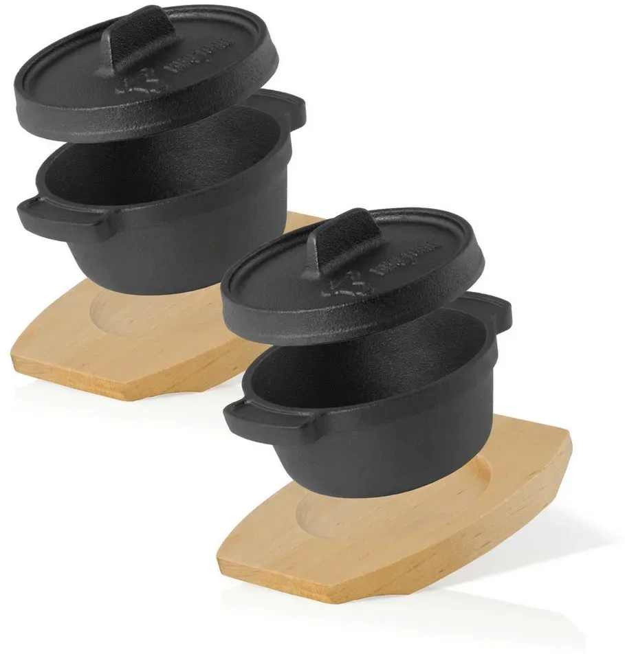 lieferbar-in 3-4 Werktagen bei dirBBQ-Toro Serviertopf Mini Dutch Oven (2 Stück), 11 cm, Gusseisen Topf mit Holzunterlage, Gusseisen (Set) schwarz