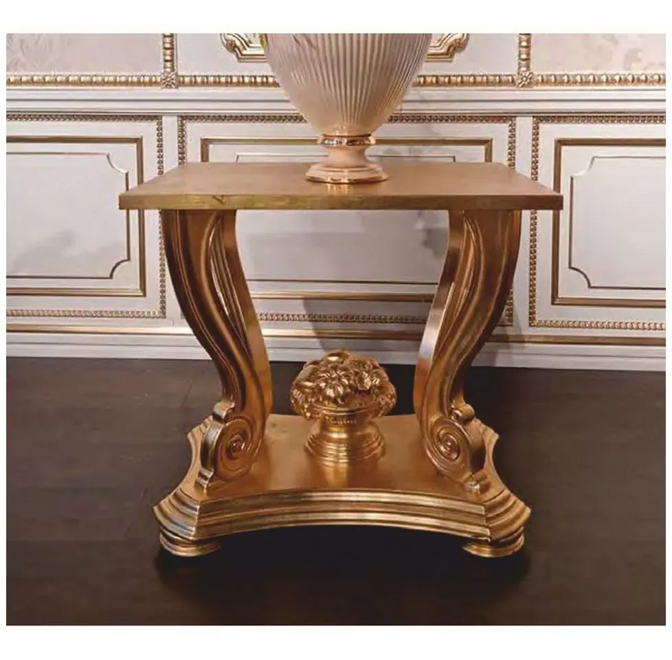 keine Angabe Gewöhnlich versandfertig in 2 bis 3 WochenGoldener Quadratischer Beistelltisch im Französischen Barock Rokoko Stil, Handgefertigter Beistelltisch aus Holz mit Kamelfarbener Marmorplatte, Goldener Couchtisch, Teetisch als Wohndekoration