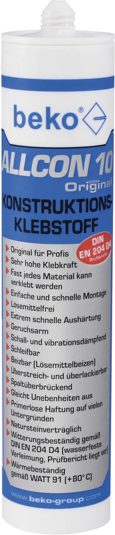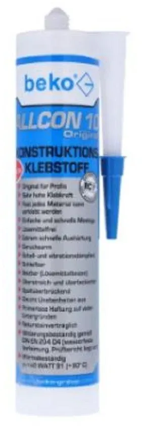 54,48 / 1 l - Kategorie: Klebeprodukte - Beko - GTIN:4036421260101 - Witterungsbeständig gemäß DIN EN 204 D4, Allcon 10 verbindet nahezu alle Materialien, Er ist einfach in der Handhabung, Der Kleber ist einkomponentig, lösemittelfrei, siliconfrei, alterungsbeständig, frostsicher, natursteinverträglich, hohe .. - 16,89 Euro bei koempf24.de - gefunden von billiger.de Für 17.69 Euro erhalten Sie hier die 310 ml Kartusche, was ein durchschnittlicher Preis ist. ![]() ![]() Beko Allcon 10 Konstruktionsklebstoff 310 ml