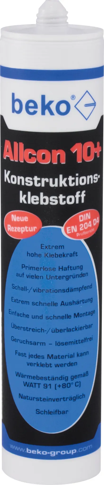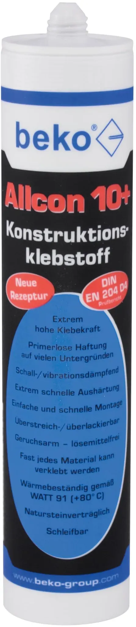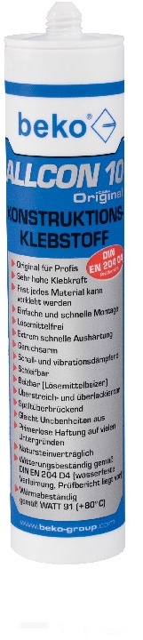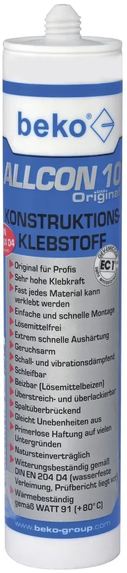 Beko allcon 10 META PreisvergleichMit dem Meta-Preisvergleich suchen Sie gleichzeitig bei den großen Preisvergleich Portalen!Jetzt live Suche nach beko allcon 10 starten! Beko allcon 10 KaufberatungDer Beko Allcon 10 ist ein hochwertiger, einkomponentiger Konstruktionsklebstoff auf Polyurethan-Basis (PU), der sich durch seine Vielseitigkeit und Profiqualität auszeichnet. Er verbindet nahezu alle Materialien wie Holz, Span-, Faserplatten, MDF, Metalle, Aluminium, Natur- und Kunststein, Beton, Marmor, Keramik, Kunststoffe, Gipsplatten, Schaumstoff (EPS), Hartschaum, Acryl und Isolierungen[1][2][3][4]. Wichtige Merkmale und Vorteile des Beko Allcon 10 sind: