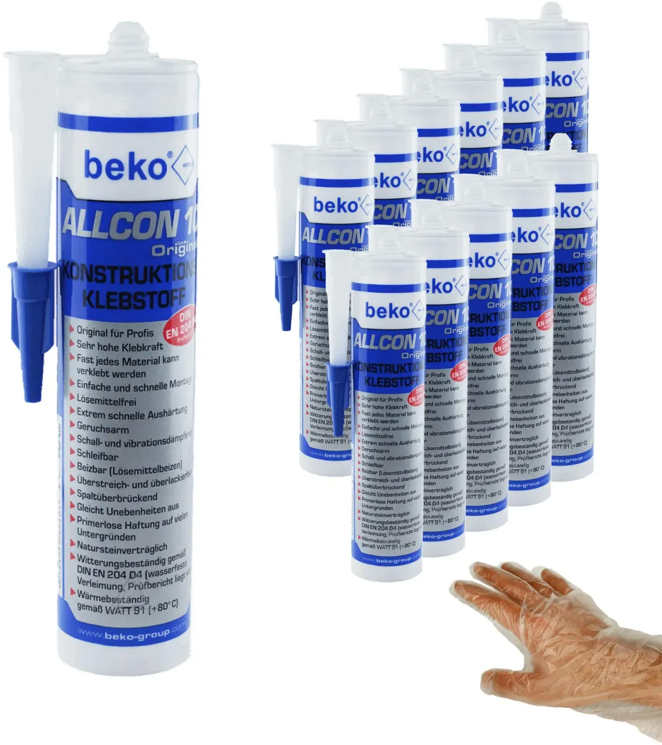 ![]() ![]() 12x Beko Allcon 10 Konstruktionskleber 310 ml + 12 Paar Einweghandschuhe