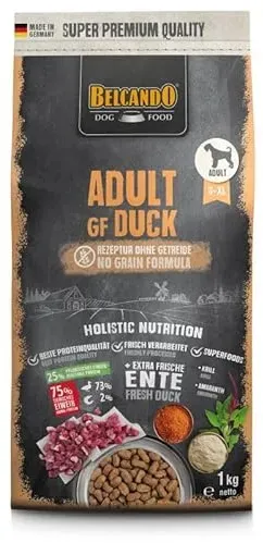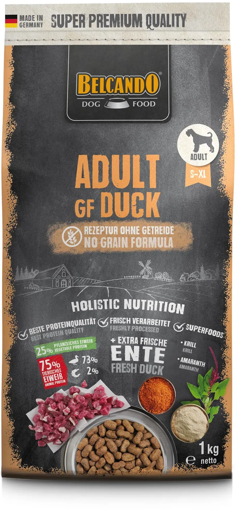 Auf Lager Versand durch AmazonBelcando Adult GF Duck | 1 kg | Alleinfuttermittel für ausgewachsene Hunde | Bei normaler bis erhöhter Aktivität | Bei Sensitivität auf Getreide | Mit Omega 3