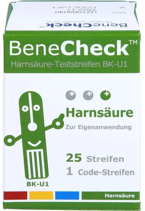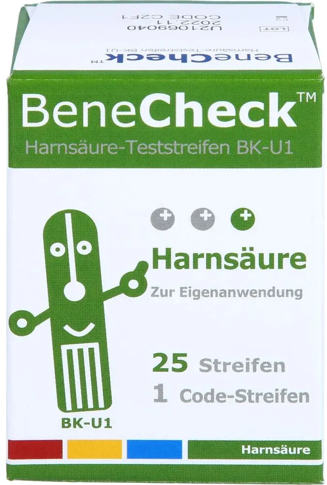 Preisbereich und KaufempfehlungPreisübersicht (Stand 2025) | Produkt | Stückzahl | Preis (ca.) | Hinweis | |---------|-----------|-------------|---------| | BeneCheck Harnsäure-Teststreifen | 25 | ab 19,25 CHF (ca. 20 €) | [7] | | BeneCheck Harnsäure-Teststreifen | 50 | ab 38,39 €/Stk. (ab 4 Stk.) | [2] | | BeneCheck Harnsäure-Teststreifen | 75 | ab 65,90 € | [8] | | BeneCheck Harnsäure-Teststreifen | 100 | ab 79,90 € | [14] | | BeneCheck Premium UA Messgerät + 35 Streifen + 100 Lanzetten | 1 Gerät + 35 Streifen | ab 49,56 € | [17] | Kaufempfehlung