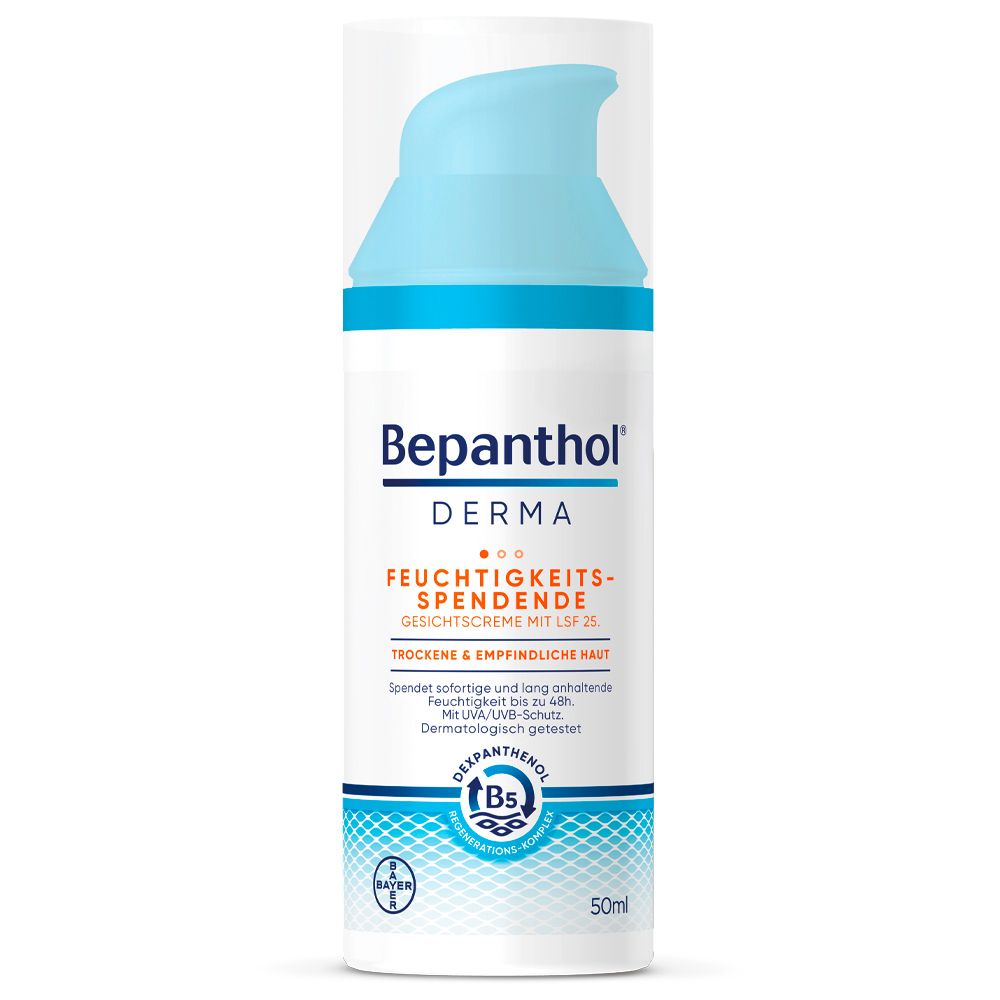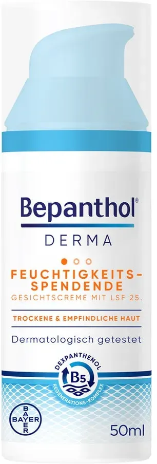Auf Lager Versand durch AmazonBepanthol DERMA Feuchtigkeitsspendende Gesichtscreme mit LSF 25, Gesichtspflege für empfindliche und trockene Haut, dermatologisch getestet, mit Dexpanthenol, nicht-komedogene 50 ml Pumpflasche