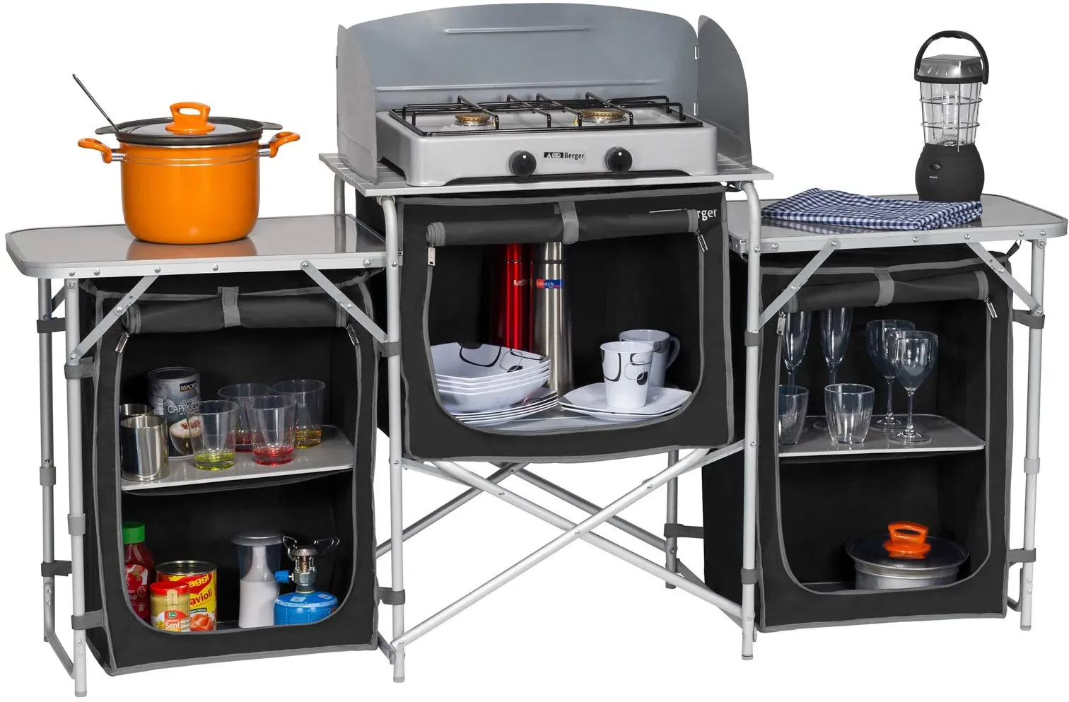 Verfügbarkeit: Auf Lager - Kategorie: Campingmöbel - Berger - GTIN:4036231045103 - œ HOCHWERTIGES MATERIAL: Die Campingküche besteht aus eloxiertem Alu-Rundrohr, einer zentralen, rollbaren Alu-Arbeitsplatte, 2 seitlichen Ablagen aus beschichteter Hartfaserplatte und 3 Gewebeschränken mit Reisverschluss und Ablagefächern. Durch eine abwischbare Schutzfolie unter der Alu-Rollplatte ist die Campingküche leicht zu reinigen. œ LEICHTER AUFBAU: stabiles, leichtes Aluminium-Gestänge - in Sekundenschnelle aufgebaut. Da der Campingschrank klappbar ist, ist der Schrank schnell auf- und abgebaut. Dank der höhenverstellbaren Füße können Bodenunebenheiten problemlos ausgeglichen werden. œ PRAKTISCH & PLATZSPAREND: Der Campingschrank bietet mit seinen vielen Ablageflächen und Stauräumen genügend Platz für Kochutensilien und Vorräte und wird so zur echten Familien Campingküche. Die obere Ablage eignet sich ideal für einen Gaskocher, ein Kochfeld oder ein Spülbecken. Der Outdoor Küchenschrank kommt inklusive Windschutz und Tragetasche. œ EINSATZBEREICH: Campingküche für Camping und Outdoor-Aktivitäten. Auch für das Vorzelt oder Zelt, Garten und zu Hause in der Küche eine praktische Alternative. Kann ebenfalls als Kleiderschrank genutzt werden. œ 100 % SERVICEORIENTIERT: Ihre Zufriedenheit ist uns wichtig. Kontaktieren Sie uns jederzeit, wenn Sie Fragen oder Probleme haben. Wir antworten Ihnen schnellstmöglich. - 104,99 Euro bei Amazon Marketplace Kitchen - ... Dieser klappbare Campingstuhl bietet hohen Komfort und Stabilität, ideal für Camping und Garten, und ist bis 200 kg belastbar. ![]() ![]() BERGER Tesino XL Campingstuhl klappbar | 7-Fach verstellbar & gepolstert | Faltbarer Outdoor-Stuhl mit 3D-Mesh | Komfortabler Klappstuhl bis 200 kg für Camping & Garten (Stuhl, Tesino XL)