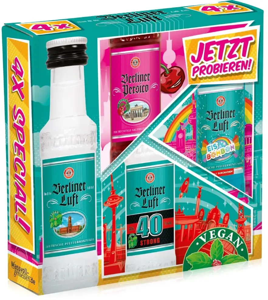 0,79 /l - Kategorie: Likör & Kräuterschnaps - Berliner Luft - GTIN:4013228325905 - Berliner Luft das ist nicht nur ein Name, sondern ein Lebensgefühl. Hergestellt von der Berliner Traditionsdestillerie Schilkin, bringt dieser Pfefferminzlikör frischen Wind ins Glas. In der praktischen 0,02 l Flasche ist er der perfekte Begleiter für unterwegs, Partys oder einfach zwischendurch. Klare Rezeptur, ohne Schnickschnack vegan, farbstofffrei und eiskalt ein echter Hit.Eiskalt als Shot? Funktioniert immer. Schmeckt herrlich minzig, schön kühl und nicht zu süß. Genau richtig, wenn s frisch und nicht zu stark sein soll. Auch im Longdrink oder Cocktail macht er ordentlich was her Berliner Luft geht immer!Berliner Luft passt ideal zu ausgelassenen Abenden mit Freunden, spontanen Feiern oder lauen Sommernächten auf dem Balkon. Dieser Likör bringt Minzgeschmack auf den Punkt perfekt, wenn gute Laune, Musik und ein bisschen Großstadtflair gefragt sind. - 0,79 Euro bei Schneekloth Weindepot - gefunden von billiger.de Diese Geschenkbox mit verschiedenen kleinen Flaschen ist ideal, um verschiedene Sorten zu probieren oder als Mitbringsel. ![]() ![]() Berliner Luft Special Box 23% Vol. 4x0,02l in Geschenkbox