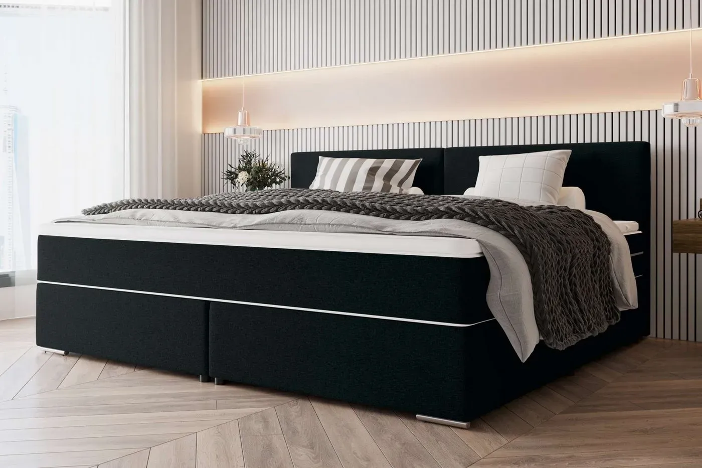 ![]() ![]() 99rooms Boxspringbett Phönix Familienbett (Schlafzimmerbett, Bett), mit Taschenfederkernmatratze und Topper, in Webstoff MALMO_NEW schwarz