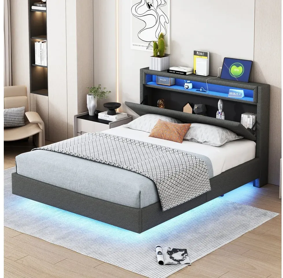 ![]() ![]() Flieks Polsterbett, LED Doppelbett 140x200cm mit USB-Laden und Stauraum am Kopfteil Leinen grau 141 cm x 214 cm x 106 cm
