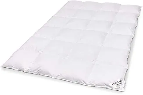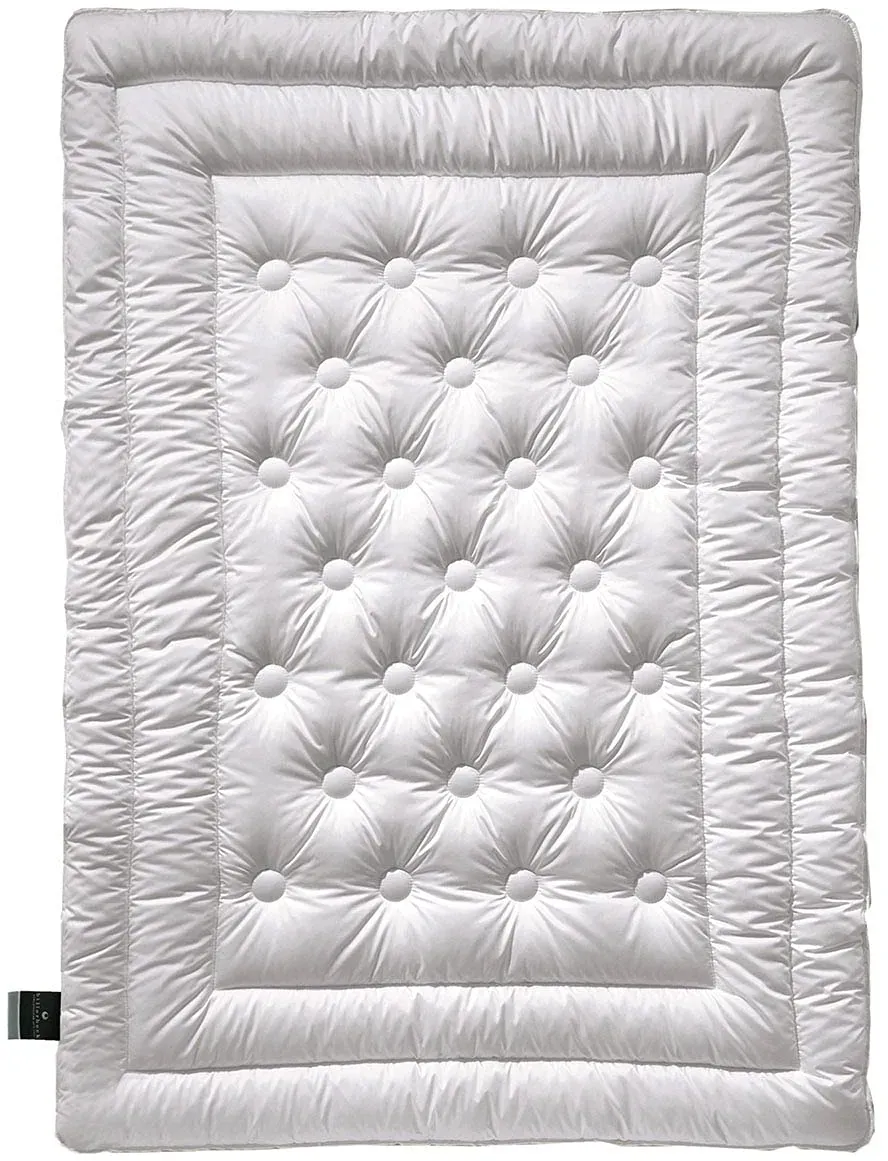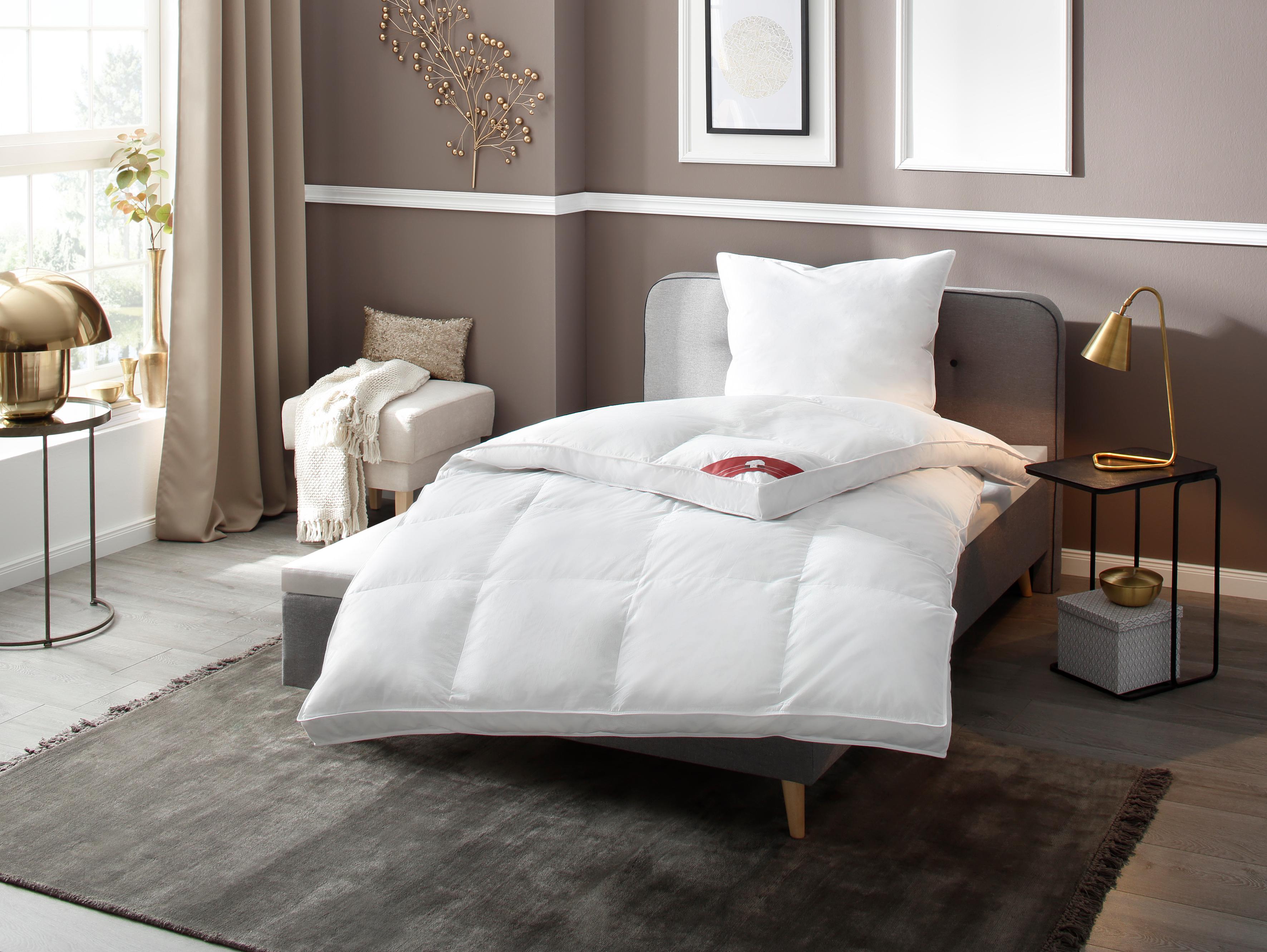 Kategorie: Winterdecken - AURA DOWN BEDDING - WäRMEKLASSE: Extra warm, 4x6 Kassettenbett mit Innensteg FüLLUNG: 1050g 90% weiße ungarische Daunen Klasse I - Eine der hochwertigsten Daunen der Welt, außergewöhnliche Füllkraft und Wärme BEZUG: Feine 100% Premium-Baumwoll-Einschütte, Oeko-Tex Standard 100 ETHISCH: HDTS (Ungarisches Daunenverfolgungssystem) rt den Ursprung der Daune. Keine Lebendrupfung, Käfighaltung und Zwangsfütterung, alle Daunen und Federn stammen aus der Lebensmittelindustrie. Das Produkt wird mit einem QR-Code geliefert. Mit dem Code kann die Daunenfüllung über die HDTS-Website bis zur Farm zurückverfolgt werden. SafeDown rt die Einhaltung der strengsten Gesundheitsvorschriften. PFLEGELEICHT: Die Bettdecke kann bei einer Temperatur von bis zu 30 C in der Maschine gewaschen werden. Verwenden Sie nur eine sehr geringe Menge Weichspüler, da er die Füllkraft der Daunen verringern kann. - 184,99 Euro bei Amazon Marketplace Home - gefunden von billiger.de Dieses Daunenbettdecken-Set mit Kopfkissen bietet eine extra warme Lösung und ist von einem renommierten Hersteller. ![]() Daunenbettdecke + Kopfkissen HAEUSSLING 'Swiss Royal', weiß, B/L: 135cm x 200cm Anzahl Teile 1, B/L: 40cm x 80cm Anzahl Teile 1, Bezug: Baumwolle Füllung: Entendaune/-feder, extrawarm, Bettdecken Bezug: 100% Baumwolle. Kopfkissen Bezug: 100% Baumwolle. Füllung Außenkammer: 90% Entendaune, 10% Entenfeder. Füllung Innenkammer: 100% Entenfeder. Bettdecken Füllung: 90% Entendaune, 10% Entenfeder, Bett