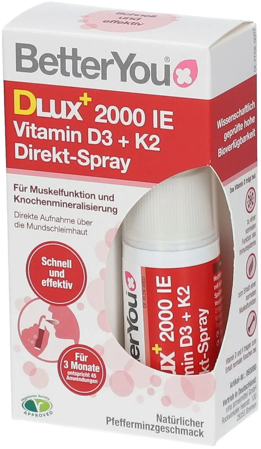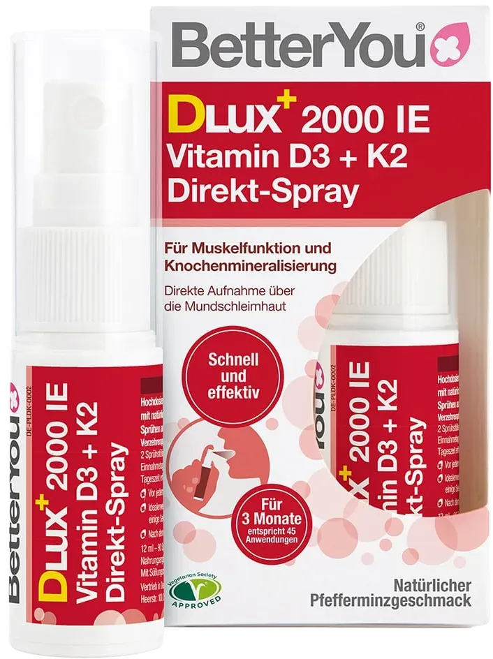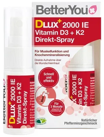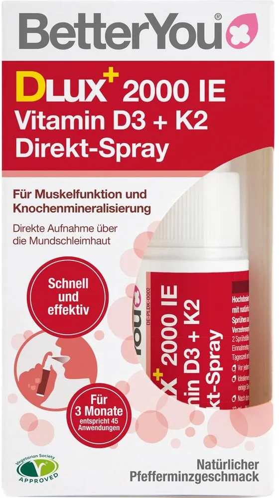 BetterYou - EAN: 0000040565088 - Nahrungsergänzungsmittel sind kein Erssatz für eine abwechslungsreiche und ausgewogene Ernährung und eine gesunde Lebensweise.BetterYou DLUX 2000 IE Vitamin D3+K2 Direkt-SprayFür Muskelfunktion und KnochenmineralisierungVitamin D trägt bei: zu... - bei shop-apotheke.com - aus Yadore Produktdaten ![]() ![]() Betteryou Vitamin D3+K2 Direkt-Spray 12 ml Spray