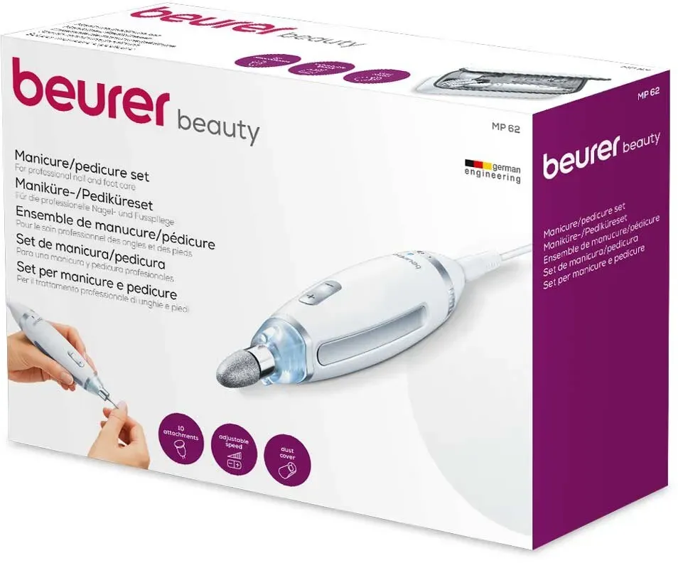 Kategorie: Nagelpflege - Beurer - GTIN:4211125105198 - PROFESSIONELLE NAGELPFLEGE 10 hochwertige Aufsätze aus Saphir und Filz zum Formen und Polieren von Nägeln und Entfernen harter Haut: für Diabetiker geeignet Einfach zu bedienen: Während der MP62 professionelle Ergebnisse liefert, ist er der perfekte Nagelbohrer für Anfänger und Profis gleichermaßen LEISTUNGSSTARK - Mit einer Drehzahl von bis zu 5400 U/min ist dies unser schnellstes elektrisches Maniküregerät für das glatteste Finish Ergonomisches Design: Entworfen mit einer weichen rutschfesten Oberfläche und LED-Präzisionslicht für feinere Details Lieferumfang: 1 x Maniküre- und Pediküre-Gerät, 10 x hochwertige Aufsätze aus Saphir und Filz, 10 x Einwegaufsätze aus Schleifpapier, 1 x Adapter, 1 x Aufbewahrungstasche, 1 Bedienungsanleitung (evtl. nicht in deutscher Sprache) - 68,03 Euro bei Amazon Marketplace Automotive - gefunden von billiger.de OTTO bietet das Beurer MP 62 Maniküre-Pediküre-Set zu einem mittleren Preis an, was auf ein gutes Preis-Leistungs-Verhältnis schließen lässt. ![]() ![]()