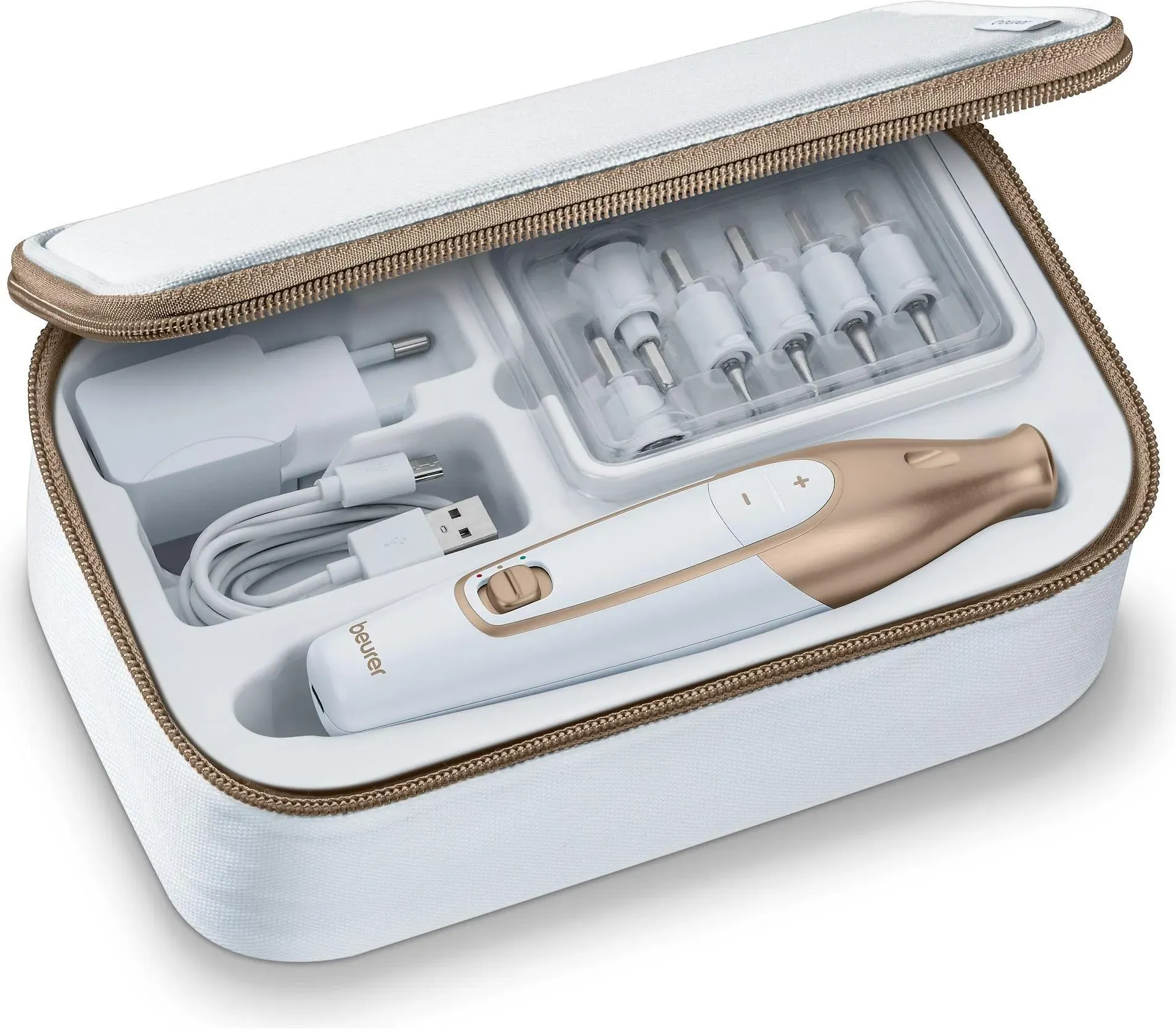 Auf Lager Versand durch AmazonBeurer MP 64 Maniküre/Pediküreset, elektrisches Nagelpflegeset mit Akku, 10 Aufsätze zur Nagelpflege für schöne Hände und Füße, mit LED Licht, Einheitsgröße, White and gold
