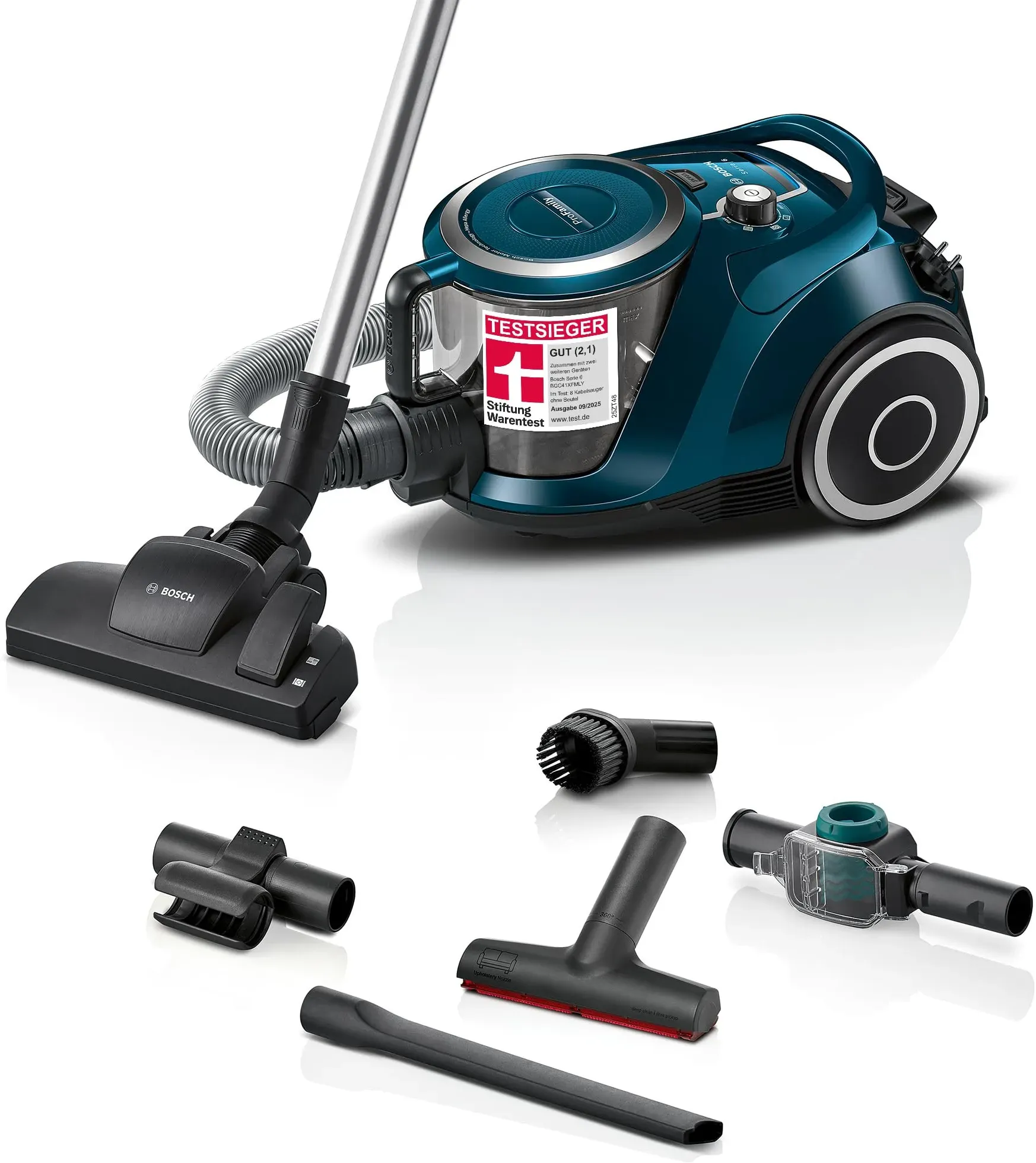 Auf Lager Versand durch AmazonBosch Staubsauger beutellos Serie 6 ProFamily BGC41XFMLY, ideal für Allergiker, Hygiene-Filter, 10 J. Motorgarantie, Spielzeugfalle, XXL-Polsterdüse, XXL-Fugendüse, hohe Saugkraft, leise, 750 W, blau