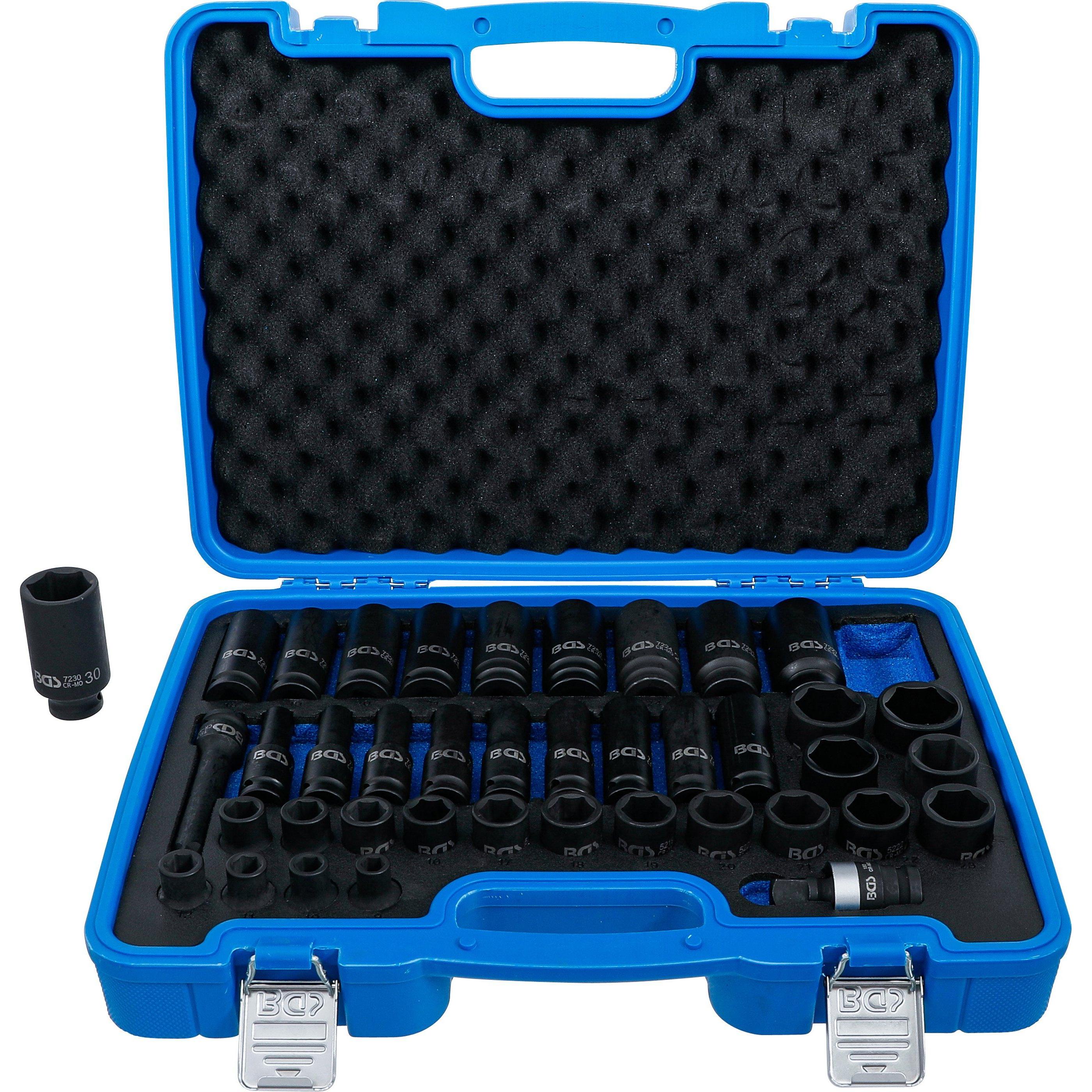 Zustand: Neu - Steckschlüsseleinsätze - BGS - 7280 - EAN: 4026947072807 - Kraft-Steckschlüssel-Einsätze Sechskant in kurzer und tiefer Ausführung | inkl. Kraft-Kugelgelenk und Kraft-Verlängerung für Arbeiten an schwer zugänglichen Stellen | kompakte Satz Zusammenstellung mit allen gängigen Schlüsselweiten | geeignet für Hand- und Schlagschrauberbetrieb | mit Aufnahme für Arretierstift und Gummiring sichere und ordentliche Aufbewahrung im Kunststoffkoffer | Einlage aus robustem, hochwertigem Hartschaum | die Werkzeuge sind geschützt in der Hartschaumeinlage und werden verrutschsicher in den Aussparungen verstaut | jedes einzelne Werkzeug hat seinen entsprechenden Platz Abtriebsprofil: Pro Torque (Sechskant) | Antriebsprofil: Innenvierkant | Antriebsprofilgröße, metrisch: 12,5 mm | Antriebsprofilgröße, imperial: 1/2' | Oberflächenvergütung: phosphatiert | Material: Chrom-Molybdän-Stahl Lieferumfang: 19 Kraft-Steckschlüssel-Einsätze Sechskant | Antrieb Innenvierkant 12,5 (1/2') | SW 9 mm (Art. 5439) - 10 mm (Art. 5210) - 11 mm (Art. 5211) - 12 mm (Art. 5212) - 13 mm (Art. 5213) - 14 mm (Art. 5214) - 15 mm (Art. 5215) - 16 mm (Art. 5216) - 17 mm (Art. 5217) - 18 mm (Art. 5218) - 19 mm (Art. 5219) - 20 mm - 21 mm (Art. 5221) - 22 mm (Art. 5222) - 23 mm - 24 mm (Art. 5224) - 26 mm - 27 mm (Art. 5227) - 30 mm (Art. 5230) 1 Kraft-Steckschlüssel-Einsätze Sechskant, tief | Antrieb Innenvierkant 12,5 mm (1/2') | SW 9 mm - 10 mm (Art. 7210) - 11 mm (Art. 7211) - 12 mm (Art. 7212) - ... ![]() ![]() BGS Kraft-Steckschlüssel-Einsatz-Satz Sechskant | Antrieb Innenvierkant 12,5 mm (1/2') | SW 9 - 30 mm... (27 mm, 15 mm, 26 mm, 16 mm, 11 mm, 24 mm, 13 mm, 18 mm, 30 mm, 9 mm, 29 mm, 20 mm, 25 mm, 19 mm, 12 mm, 10 mm, 21 mm, 17 mm, 14 mm, 22 mm, 23 mm, 28 mm) (7280)