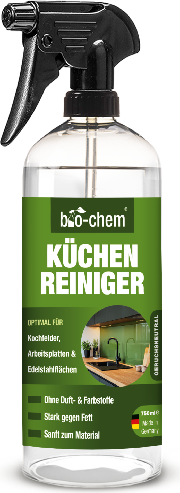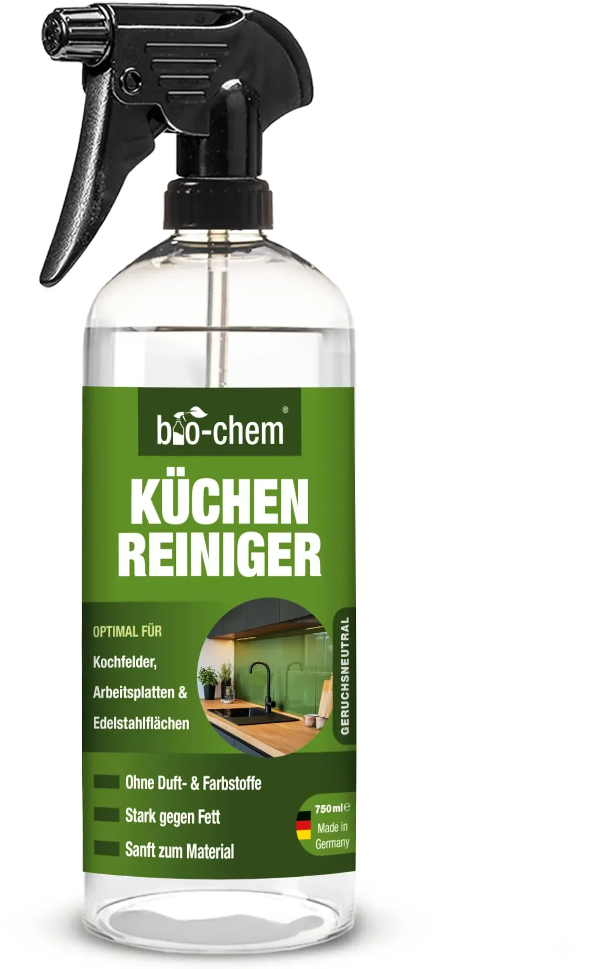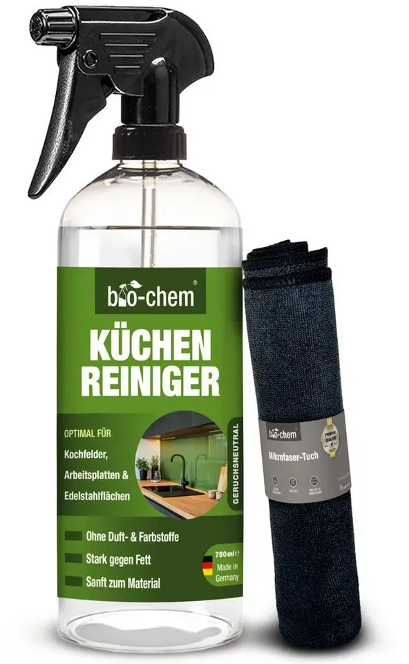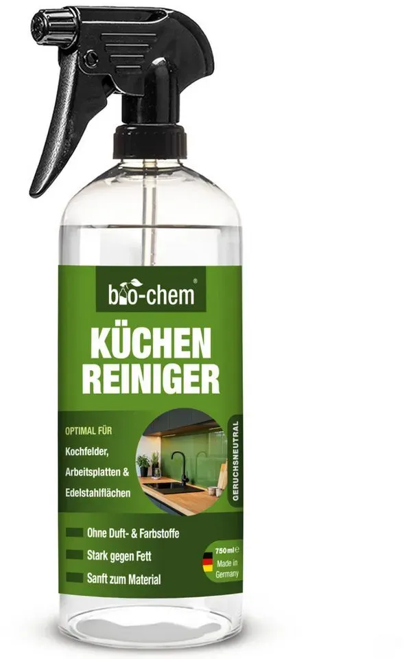 19.87 /1l - Kategorie: Reinigungsmittel - Biochem - GTIN:4024048800916 - Produktdetails Inhaltsstoffe , Ohne Farb- und Duftstoffe, Farbe Farbe , 1) 750 ML, - 14,90 Euro bei OTTO - gefunden von billiger.de ![]() ![]() bio-chem Küchenreiniger - 750 ml Handsprayflasche - Kraftreiniger Fettlöser Ceranfeldreiniger Edelstahlreiniger für Ceranfeld, Induktionskochfeld, Küchenarmatur, Küchenfront, Arbeitsplatte