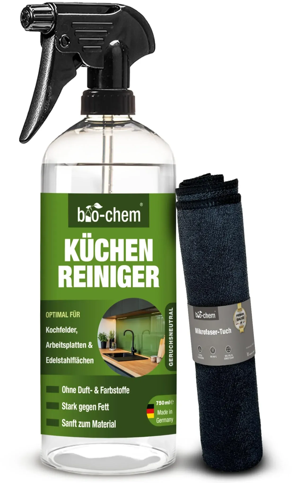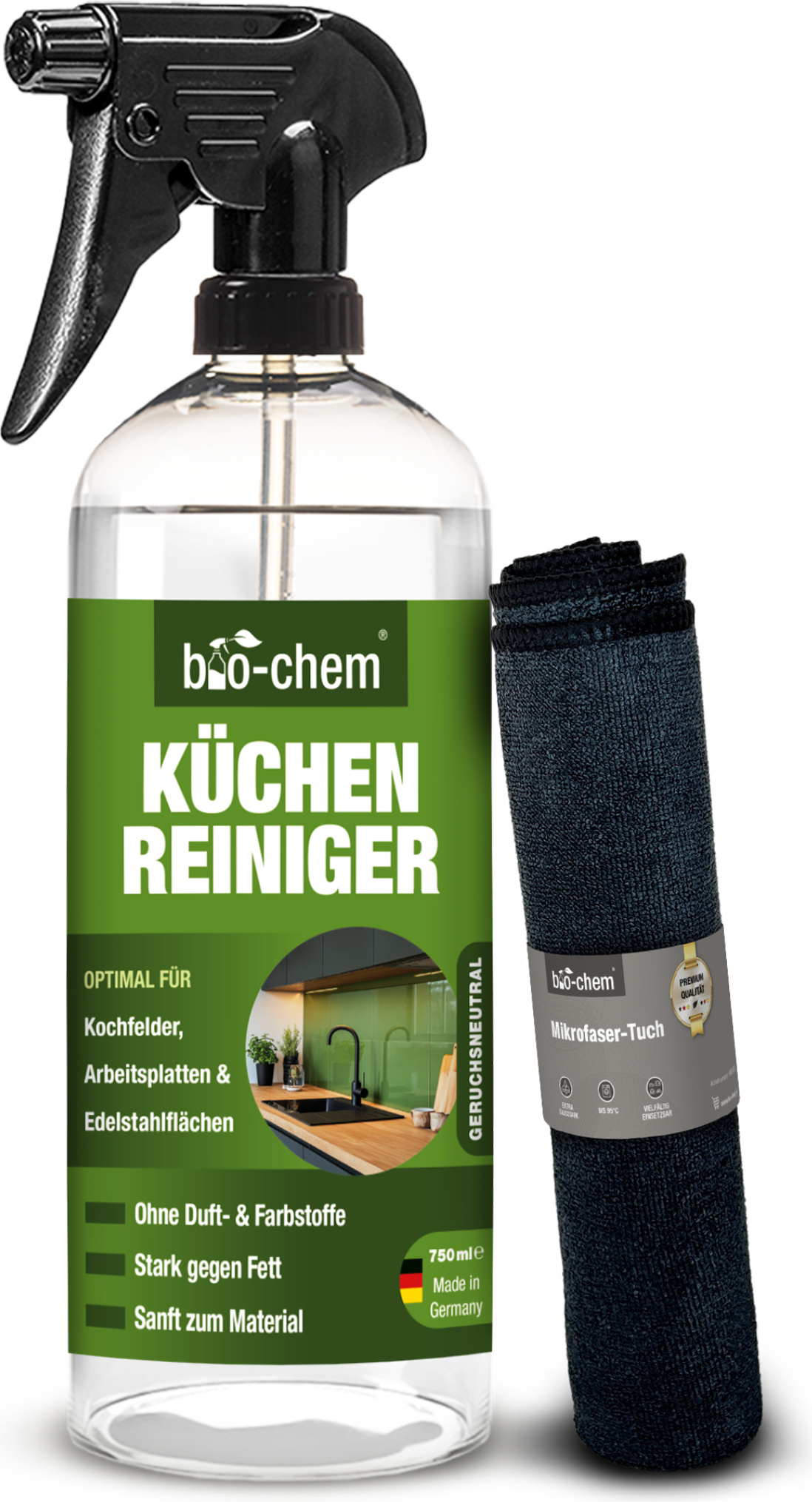 EAN: 4024048800916 - EFFIZIENT Der Küchenreiniger von bio-chem entfernt mühelos öl, Fett, Eiweiß und Rückstände von Speisen und Getränken. Perfekt als Fettlöser für Ceranfelder und Induktionsplatten. SCHONEND Geeignet für empfindliche Oberflächen wie Marmor, Edelstahl, Kunststoff und mehr. Dank der milden Inhaltsstoffe auch für Oberflächen mit direktem Lebensmittelkontakt unbedenklich. UNIVERSELL EINSETZBAR Ein unverzichtbarer Küchenhelfer! Ideal für Ceranfelder, Induktionsplatten, Küchengeräte, Dunstabzugshauben, Arbeitsplatten, Spülbecken und vieles mehr. BESONDERHEIT Der Gelreiniger haftet gut an senkrechten Flächen und besteht aus biologisch leicht abbaubaren Inhaltsstoffen. Er ist materialschonend, frei von Farb- und Duftstoffen und sicher für Haushalte mit Kindern und Haustieren. GEHEIMTIPP Für hartnäckige Verkrustungen empfehlen wir den bio-chem Rauchharz-Entferner , der selbst eingebrannte Ablagerungen löst. überzeuge dich von unserer effektiven Industriequalität! Liegt Dir die Umwelt und Nachhaltigkeit vor allem beim alltäglichen Putzen am Herzen? Dann ist dieser Küchenhelfer aus biologisch leicht abbaubaren Wirkstoffen genau der richtige Reiniger für Dich. Er ist frei von Duft-, Farbstoffen und kennzeichnungspflichtigen Inhaltstoffen und besitzt trotz seiner milden Formel eine sehr starke Reinigungskraft. Du kannst den Reiniger überall in der Küche anwenden und hinterlässt dabei keine Schlieren. Ob auf den Arbeitsflächen, Ceranfeld- oder Induktionsfeld, ... ![]() ![]() bio-chem Küchenreiniger - 750 ml Handsprayflasche + Mikrofasertuch - Kraftreiniger Fettlöser Ceranfeldreiniger Edelstahlreiniger für Ceranfeld, Induktionskochfeld, Küchenarmatur, Küchenfront, Marmor