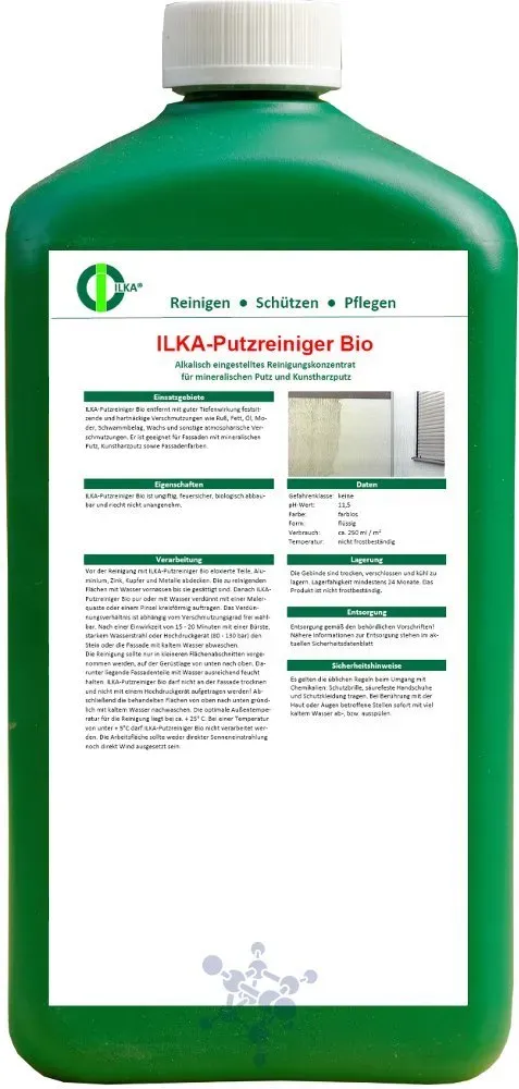 Zustand: Neu - 32,90 € / l - Spezialputzmittel - ILKA-Chemie - - EAN: 4250150801026 - œ Hochwirksamer Fassadenreiniger für mineralischen Putz und Kunstharzputz œ Geeignet für Hochdruck-Geräte œ Ungiftig, feuersicher, biologisch abbaubar œ Entfernt mit guter Tiefenwirkung festsitzende und hartnäckige Verschmutzungen wie Ruß, Fett, Öl, Moder, Schwammbelag, Wachs und sonstige atmosphärische Verschmutzungenentfernt mit guter Tiefenwirkung festsitzende und hartnäckige Verschmutzungen wie Ruß, Fett, Öl, Moder, Schwammbelag, Wachs und sonstige atmosphärische Verschmutzungen œ Es wird empfohlen, vor der Reinigung eine Versuchsfläche anzulegen. - Verkäufer: AIX-Steinsanierung im amazon.de Marketplace ![]() ![]() ILKA-Chemie ILKA - Putzreiniger Bio Fassadenreiniger | 1ltr | Intensivreiniger für Putz, Kunstharzputz sowie Fassadenfarben - Fassadenreinigung, Putzreinigung | ungiftig, biologisch abbaubar