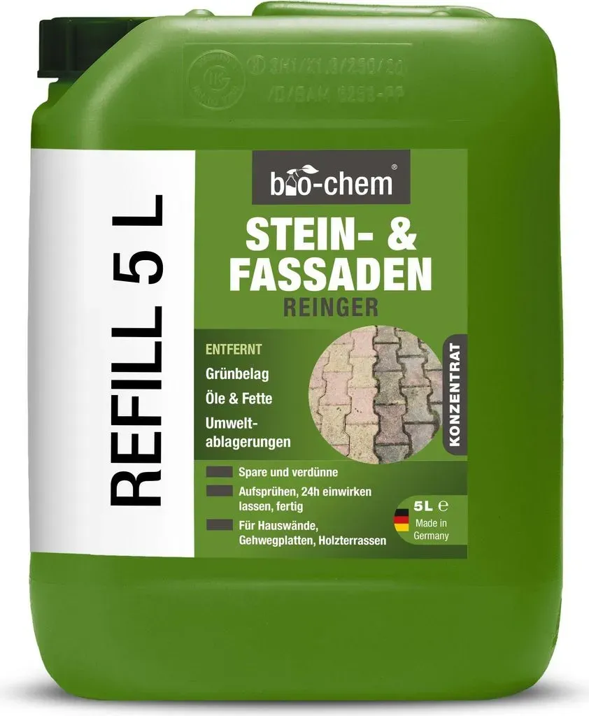8,98 /l - Kategorie: Reinigungsmittel - bio-chem CLEANTEC - GTIN:4024048800053 - SPARSAME & SELBSTTäTIGE REINIGUNG: Ergiebiges Konzentrat (1:10) für bis zu 800 m2. Ideal als Fassaden-, Stein- und Terrassenreiniger. VIELSEITIG EINSETZBAR: Für abwaschbare Oberflächen wie Naturstein, Beton, Holz, Kunststoff, Glas, Keramik, Klinker u.v.m. im Außenbereich. WOHLFüHLENDE SAUBERKEIT: Entfernt Grünbelag, Fette, öle und Schmutz von Terrassen, Fassaden, Dächern, Balkonen, Zäunen, Gehwegplatten und mehr. VERHINDERT RUTSCHGEFAHR: Hemmt Grünbildung, erhöht Sicherheit auf rutschigen Flächen und erhält den Wert von Außenanlagen. bio-chem VERSPRECHEN: Biologisch abbaubar, ohne Mikroplastik, Farb- oder Duftstoffe. - 44,90 Euro bei Kaufland.de - gefunden von billiger.de ![]() ![]() bio-chem Stein- - & Fassadenreiniger eBay 5€¯L - mit Schaumsprüher für Außenflächen