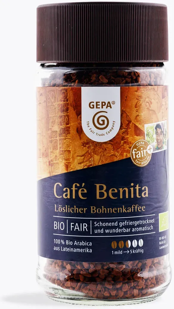 79,90 / 1 kg - Kategorie: Kaffee & Espresso - Mount Hagen - GTIN:4000799109324 - Hierbei handelt es sich um den Bio Hauskaffee von Mount Hagen in entkoffeinierter Instant Granulatform. Er setzt sich aus fruchtigen Arabicas aus Papua Neuguinea, pikant-würzigen Arabicas aus Honduras sowie vollmundigen Spitzenarabicas aus Peru zusammen. Zusammen ergeben sie einen ausbalancierten, in sich stimmigen und samtig-weichen Kaffee, der nussige Noten mit sich bringt. Entkoffeiniert wurde der Kaffee mit Quellkohlensäure, was ihn zu jeder Tages- und Nachtzeit genießbar macht. Sämtliche Arabicas stammen aus kontrolliert biologischem Anbau von den Kooperativen HOAC (Papua Neuguinea), Cocla (Peru) und Comsa (Honduras). Sie wurden handgepflückt und -verlesen und unter fairen Bedingungen gehandelt. Für die Zubereitung 1 2 gehäufte Teelöffel mit heißem, aber nicht mehr kochendem Wasser übergießen und umrühren. Der Instant Kaffee kommt in einer praktischen, wiederverschließbaren Dose mit 100g Inhalt. Mount Hagen bezieht ausschließlich fair gehandelten Kaffee und unterstützt somit die Kaffeekleinbauern aus den Ursprungsländern der Rohbohnen. - 7,99 Euro bei RoastMarket - gefunden von billiger.de Dieser GEPA Bio Caf Benita ist ein Fair Trade Instant Kaffee, der ethischen Konsum mit gutem Geschmack verbindet. ![]() ![]() GEPA Bio Caf Benita 100g Instant Kaffee