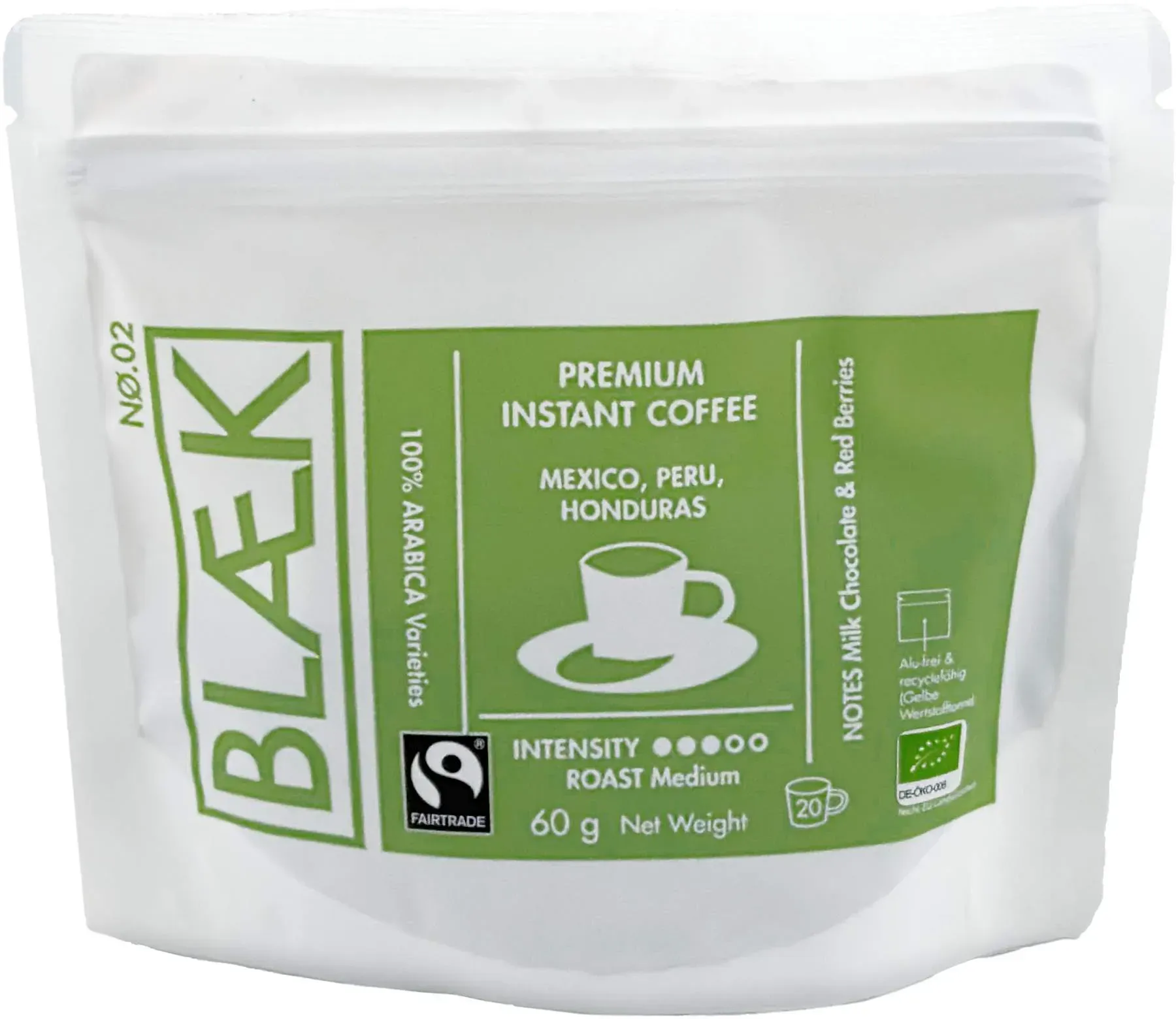 104,90 / 1 kg - Kategorie: Kaffee & Espresso - Gepa - GTIN:4013320115213 - Der Bio Caf Benita eignet sich hervorragend für den besonders schnellen Kaffeegenuss und besteht aus 100% gewaschenen Bio Arabica-Bohnen. Der Instant-Kaffee wurde in Peru, Mexiko, Bolivien und Honduras angebaut und fair gehandelt. Durch die aromaschonende Gefriertrocknung behalten die Arabica-Bohnen ihren vollen Geschmack und begeistern auch bei einem kleinen Kaffee zwischendurch. Auch als erfrischender Kaffee eignet sich der Benita ideal, dazu sollte ca. 1 Teelöffel des löslichen Kaffees mit heißem Wasser übergossen werden, bis er sich auflöst. Anschließend mit kalter Milch übergießen und je nach Belieben Eiswürfel dazu, schon steht der Eiskaffee zum Genuss bereit. Die Kleinbauern in Mittelamerika engagieren sich sehr für die hohe Qualität dieses löslichen Bio-Kaffees. Viele von ihnen haben sich zu Kooperativen zusammengeschlossen, wodurch sie unabhängig von schwankenden Weltmarktpreisen sind, ein sicheres Einkommen und ihre Zukunft selbst in der Hand haben. - 10,49 Euro bei RoastMarket - gefunden von billiger.de Ein hochwertiger Bio Instant Kaffee mit mittlerer Röstung von Blaek, der für anspruchsvolle Kaffeetrinker geeignet ist. ![]() ![]() Blaek Instant Kaffee No.2 Medium Roast Bio 60g