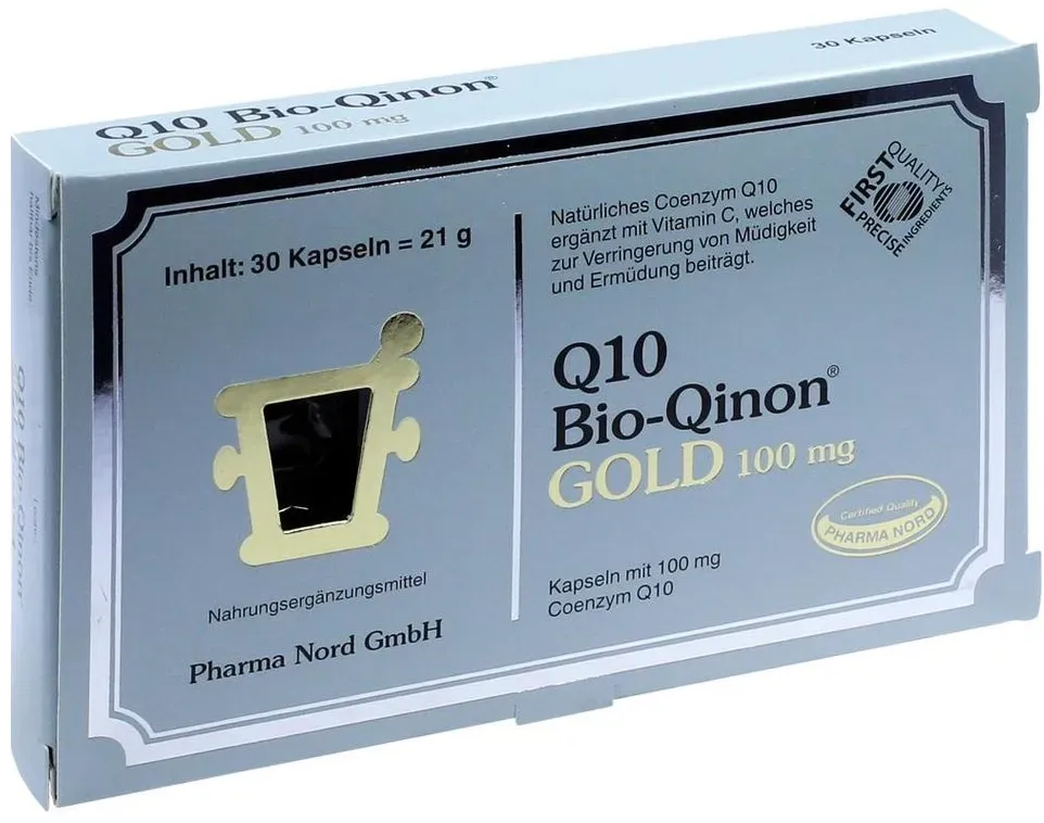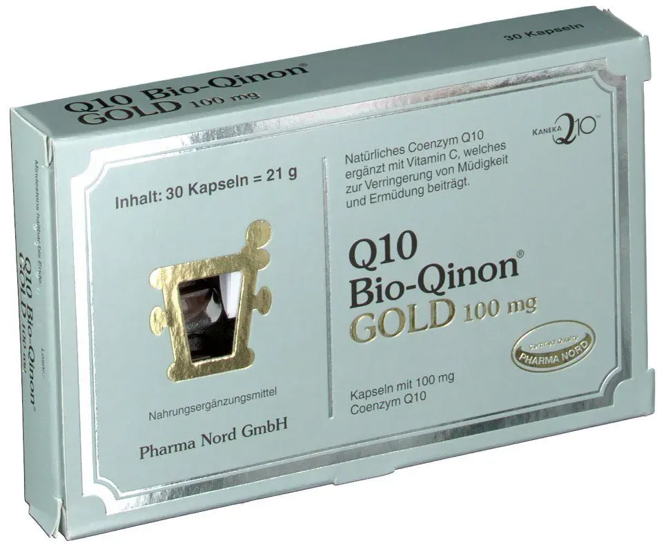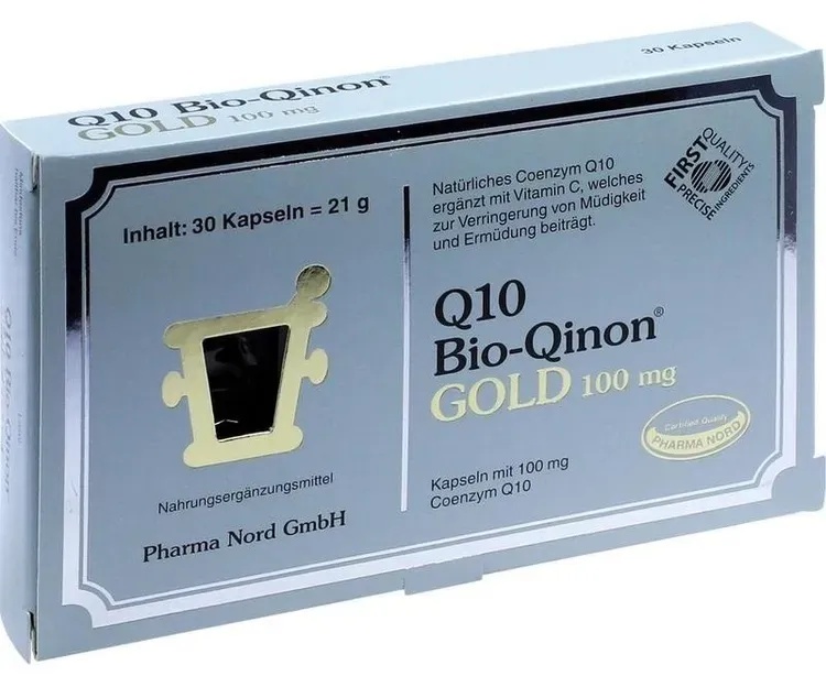 EAN: 4150015415255 - Nahrungsergänzungsmittel Natürliches Coenzym Q10 ergänzt mit Vitamin C, welches zur Verringerung von Müdigkeit und Ermüdung beiträgt Das Original Q10 Ubiquinon der Q-Symbio-Studie. Patentierte Formel mit einer hohen, dokumentierten Bioverfügbarkeit. Hohe Sicherheit und Wirksamkeit dank 2 n Anwendungserfahrung In mehr als 130 wissenschaftlichen Studien dokumentiert Mit dem natürlich auftretenden Q10 identisch (naturidentisch) Offizielles Referenzprodukt des Icqa (Internationaler Coenzym Q10-Verband Was ist Q10 Bio-Qinon? Schon seit mehreren Jahrzehnten ist Q10 Bio-Qinon Gold weltweit das am häufigsten verkaufte Q10-Präparat. Ein Hauptgrund für seine Beliebtheit ist seine erwiesene hohe Bioverfügbarkeit. Q10 ist eine fettlösliche Substanz, die der Körper nur sehr schwer aufnimmt. Dank unseres hochspezialisierten Produktionsprozesses, bei dem Q10 in Pflanzenöl aufgelöst und einer patentierten Wärmebehandlung unterzogen wird, können die Q10-Moleküle jedoch bei normaler Körpertemperatur vollständig aufgenommen werden. Die vollständige Lösung der Q10-Moleküle in diesem Produkt ist der Grund dafür, dass Q10 Bio-Qinon Gold eine höhere Bioverfügbarkeit seines Wirkstoffes erzielt. Eine äußerst sichere Substanz Untersuchungen zeigen, dass eine langfristige Q10-Zufuhr keinen Einfluss auf die körpereigene Produktion der Substanz hat. Mehr als 2 Forschung und Erfahrung in der Anwendung belegen die Sicherheit von Q10 Bio-Qinon Gold. - bei aponeo.de - aus Yadore ... Ein sehr preiswertes Angebot für 30 Kapseln, perfekt für den Einstieg. ![]() ![]() Q10 Bio Qinon Gold 100 mg Kapseln 30 stk